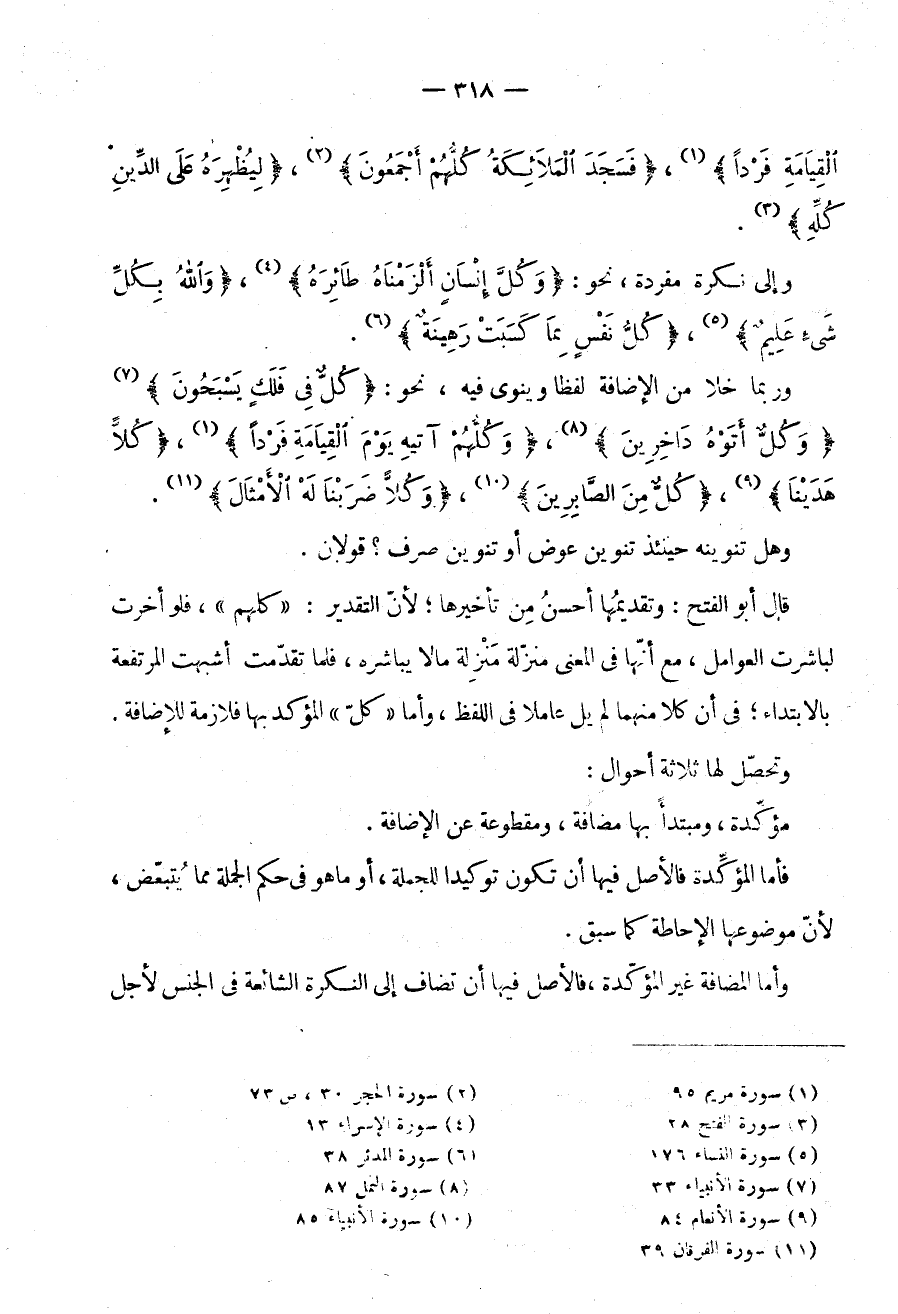 وَرُبَّمَا خَلَا مِنَ الْإِضَافَةِ لَفْظًا وَيُنْوَى فِيهِ نحو: {كل في فلك يسبحون} {وكل أتوه داخرين} {وكلهم آتيه يوم القيامة فردا} {كلا هدينا} {كل من الصابرين} {وكلا ضربنا له الأمثال} وَهَلْ تَنْوِينُهُ حِينَئِذٍ عِوَضٌ أَوْ تَنْوِينُ صَرْفٍ؟ قَوْلَانِ.