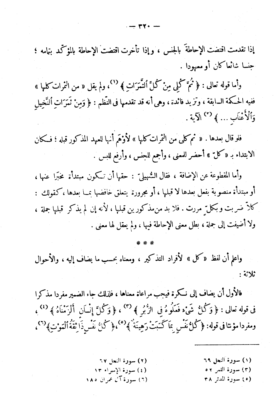 وَاعْلَمْ أَنَّ لَفْظَ كُلٍّ لِأَفْرَادِ التَّذْكِيرِ وَمَعْنَاهُ بِحَسَبِ مَا يُضَافُ إِلَيْهِ والأحوال ثلاثة: