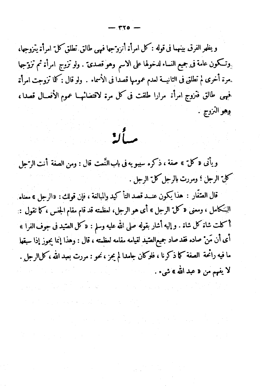 قَالَ الصَّفَّارُ: هَذَا يَكُونُ عِنْدَ قَصْدِ التَّأْكِيدِ وَالْمُبَالَغَةِ فَإِنَّ قَوْلَكَ الرَّجُلُ مَعْنَاهُ الْكَامِلُ وَمَعْنَى كُلِّ الرَّجُلِ أَيْ هُوَ الرَّجُلُ لِعَظَمَتِهِ قَدْ قَامَ مَقَامَ الْجِنْسِ كَمَا تَقُولُ أَكَلْتُ شَاةً كُلَّ شَاةٍ وَإِلَيْهِ أَشَارَ بِقَوْلِهِ صَلَّى اللَّهُ عَلَيْهِ وَسَلَّمَ: "كُلُّ الصَّيْدِ فِي جَوْفِ الْفَرَا" أَيْ أَنَّ مَنْ صَادَهُ فَقَدْ صَادَ جَمِيعَ الصَّيْدِ لِقِيَامِهِ مَقَامَهُ لِعَظَمَتِهِ قَالَ وَهَذَا إِنَّمَا يَجُوزُ إِذَا سَبَقَهَا مَا فِيهِ رَائِحَةُ الصِّفَةِ كَمَا ذَكَرْنَا فَلَوْ كَانَ جَامِدًا لَمْ يَجُزْ نَحْوُ مَرَرْتُ بِعَبْدِ اللَّهِ كُلِّ الرَّجُلِ لَا يُفْهَمُ مِنْ عَبْدِ اللَّهِ شيء