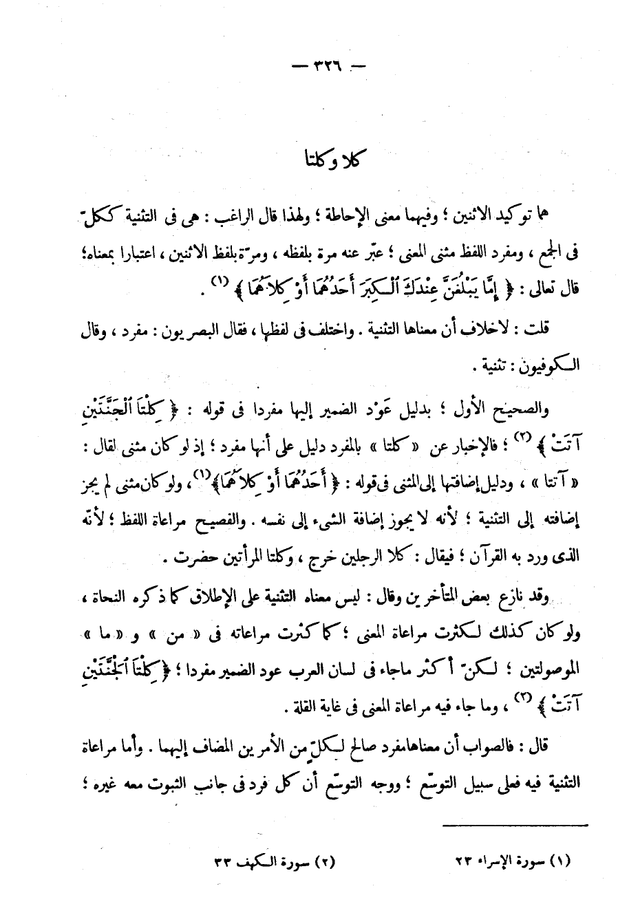 وَقَدْ نَازَعَ بَعْضُ الْمُتَأَخِّرِينَ وَقَالَ لَيْسَ مَعْنَاهُ التَّثْنِيَةَ عَلَى الْإِطْلَاقِ كَمَا ذَكَرَهُ النحاة ولو كان كذلك لكثرة مراعاة المعنى كما كثرة مراعاته في من وما الْمَوْصُولَتَيْنِ لَكِنَّ أَكْثَرَ مَا جَاءَ فِي لِسَانِ العرب عود الضمير مفردا كلتا الجنتين آتت وَمَا جَاءَ فِيهِ مُرَاعَاةُ الْمَعْنَى فِي غَايَةِ الْقِلَّةِ قَالَ فَالصَّوَابُ أَنَّ مَعْنَاهَا مُفْرَدٌ صَالِحٌ لِكُلٍّ مِنَ الْأَمْرَيْنِ الْمُضَافِ إِلَيْهِمَا وَأَمَّا مُرَاعَاةُ التَّثْنِيَةِ فِيهِ فَعَلَى سَبِيلِ التَّوَسُّعِ وَوَجْهُ التَّوَسُّعِ أَنَّ كُلَّ فَرْدٍ فِي جَانِبِ الثُّبُوتِ مَعَهُ غيره