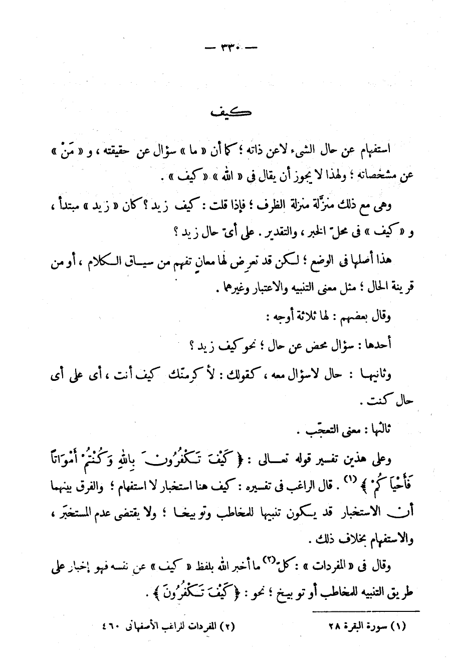 وَقَالَ: فِي الْمُفْرَدَاتِ كُلُّ: مَا أَخْبَرَ اللَّهُ بِلَفْظِ كَيْفَ عَنْ نَفْسِهِ فَهُوَ إِخْبَارٌ عَلَى طَرِيقِ التَّنْبِيهِ لِلْمُخَاطَبِ أو توبيخ نحو: {كيف تكفرون}