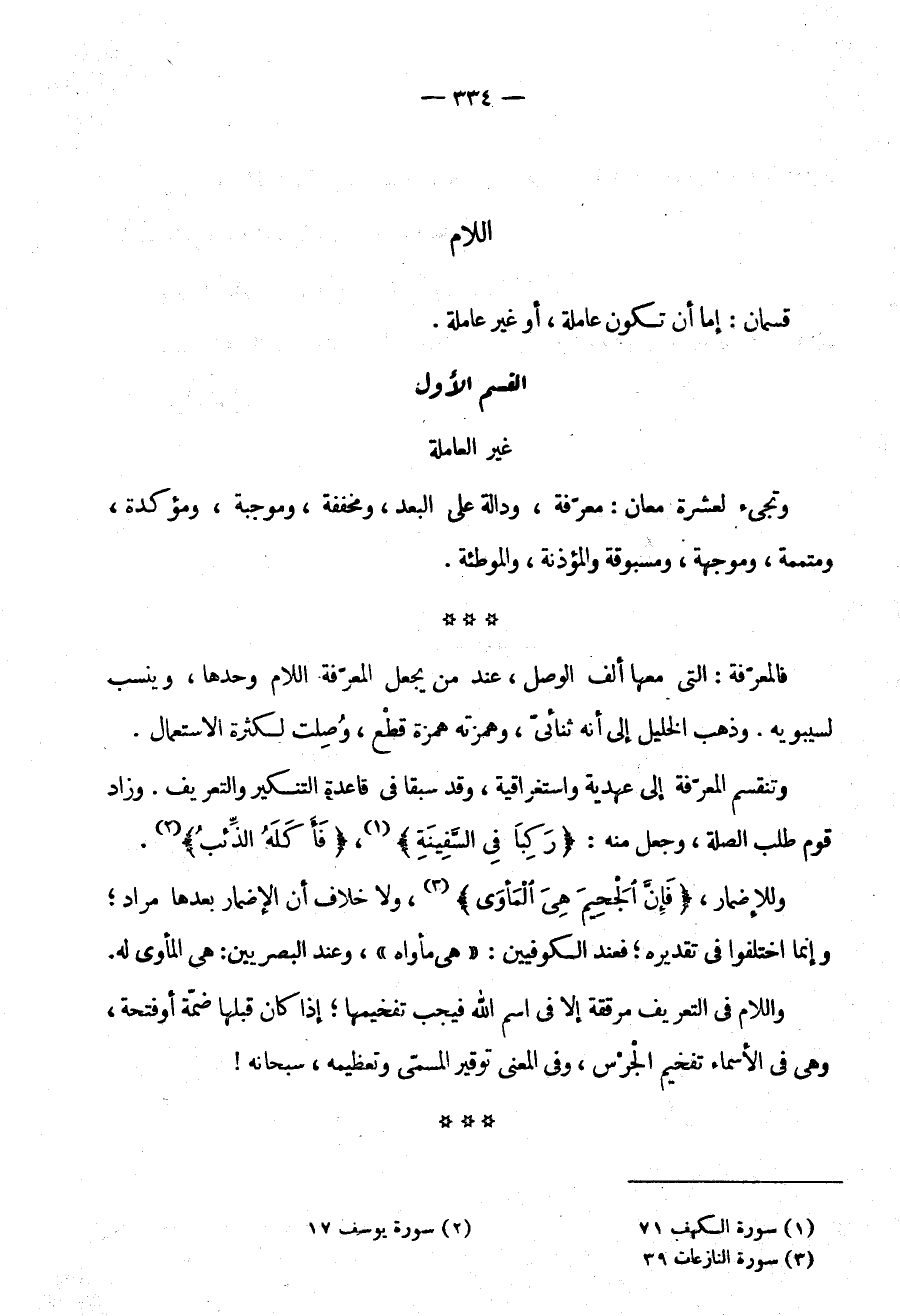 وَتَجِيءُ لِعَشْرَةِ مَعَانٍ مُعَرِّفَةٍ وَدَالَّةٍ عَلَى الْبُعْدِ وَمُخَفَّفَةٍ وَمُوجِبَةٍ وَمُؤَكِّدَةٍ وَمُتَمِّمَةٍ وَمُوَجِّهَةٍ وَمَسْبُوقَةٍ وَالْمُؤْذِنَةِ وَالْمُوَطِّئَةِ.