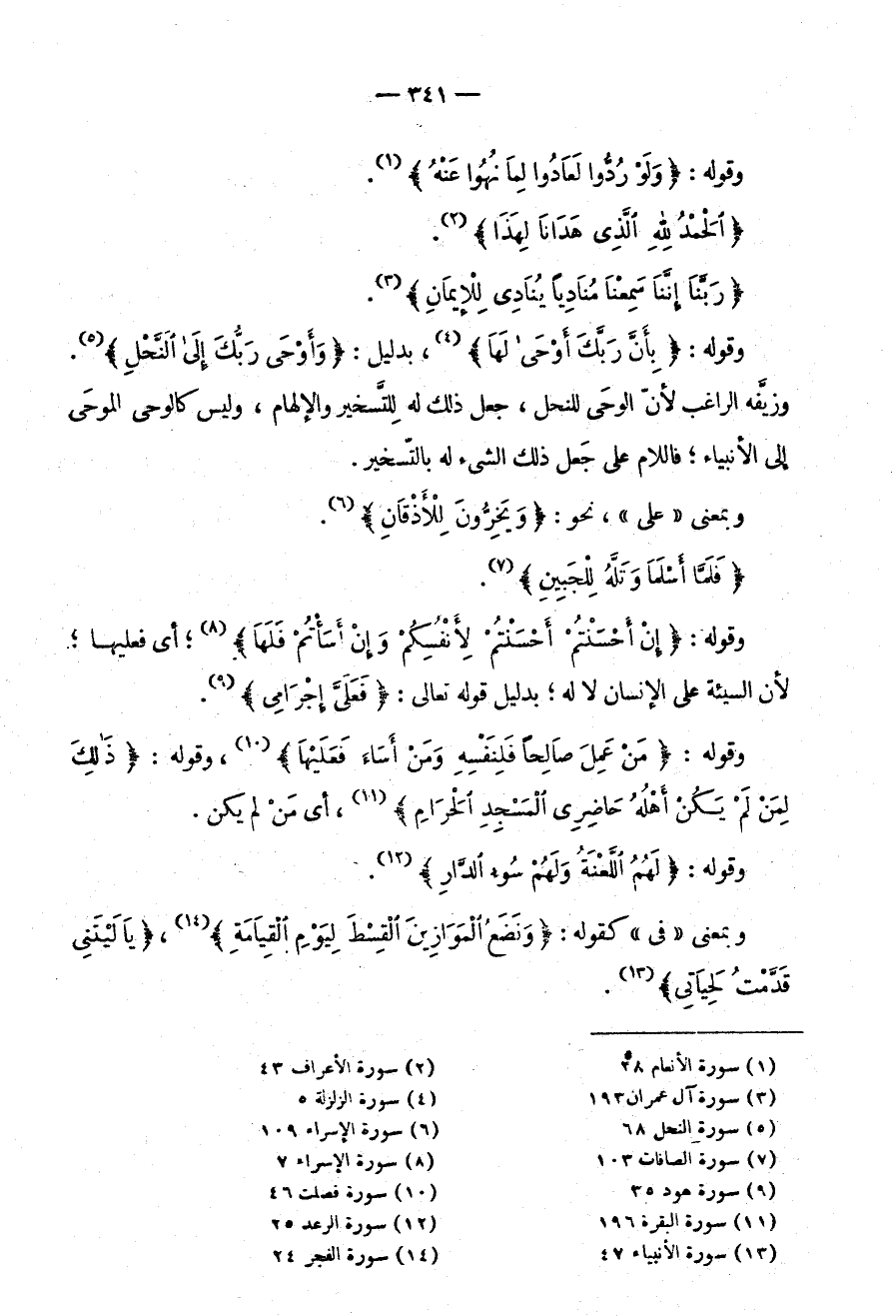 وَقَوْلِهِ: {مَنْ عَمِلَ صَالِحًا فَلِنَفْسِهِ وَمَنْ أَسَاءَ فَعَلَيْهَا} وَقَوْلِهِ: {ذَلِكَ لِمَنْ لَمْ يَكُنْ أَهْلُهُ حَاضِرِي المسجد الحرام} أي من لَمْ يَكُنْ وَقَوْلِهِ: {لَهُمُ اللَّعْنَةُ وَلَهُمْ سُوءُ الدار} وَبِمَعْنَى فِي كَقَوْلِهِ: {وَنَضَعُ الْمَوَازِينَ الْقِسْطَ لِيَوْمِ القيامة} ، {يا ليتني قدمت لحياتي} .