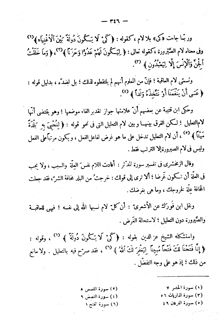 وَقَالَ الزَّمَخْشَرِيُّ: فِي تَفْسِيرِ سُورَةِ الْمُدَّثِّرِ أَفَادَتِ اللَّامُ نَفْسَ الْعِلَّةِ وَالسَّبَبِ وَلَا يَجِبُ فِي الْعِلَّةِ أَنْ تَكُونَ غَرَضًا أَلَا تَرَى إِلَى قَوْلِكَ خَرَجْتُ مِنَ الْبَلَدِ مَخَافَةَ الشَّرِّ فَقَدْ جَعَلْتَ الْمَخَافَةَ عِلَّةً لِخُرُوجِكَ وَمَا هِيَ بِغَرَضِكَ.