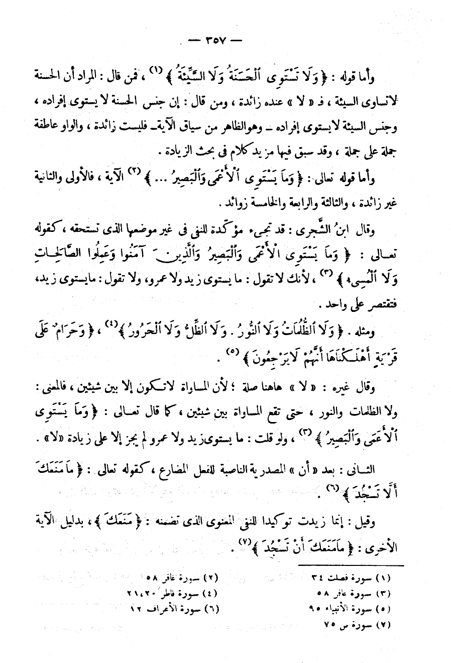 وَمِثْلُهُ: {وَلَا الظُّلُمَاتُ وَلَا النُّورُ وَلَا الظِّلُّ ولا الحرور} {وَحَرَامٌ عَلَى قَرْيَةٍ أَهْلَكْنَاهَا أَنَّهُمْ لَا يَرْجِعُونَ}