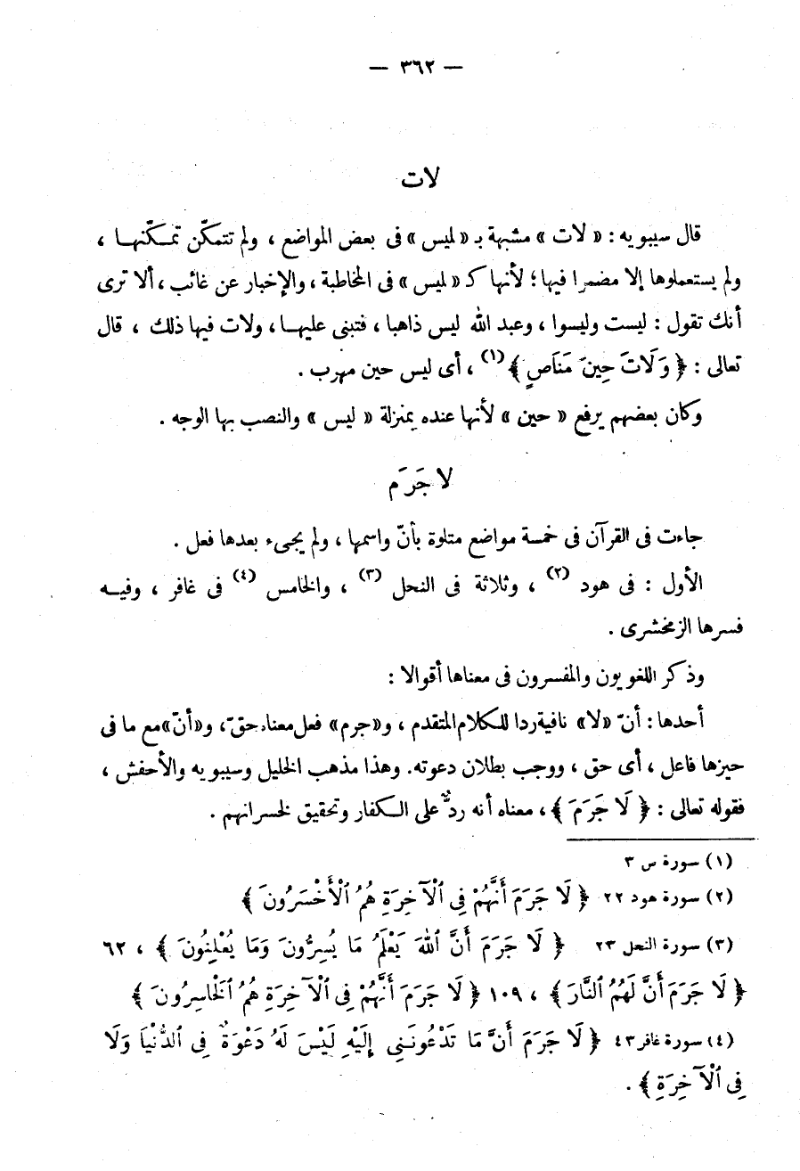 أَحَدُهَا: أَنَّ "لَا" نَافِيَةٌ رَدًّا لِلْكَلَامِ الْمُتَقَدِّمِ وَجَرَمَ فِعْلٌ مَعْنَاهُ حَقٌّ وَ"أَنَّ" مَعَ مَا فِي حَيِّزِهَا فَاعِلٌ أَيْ حَقٌّ وَوَجَبَ بُطْلَانُ دَعْوَتِهِ وَهَذَا مَذْهَبُ الْخَلِيلِ وَسِيبَوَيْهِ وَالْأَخْفَشِ فَقَوْلُهُ تَعَالَى: {لَا جَرَمَ} مَعْنَاهُ أَنَّهُ رَدٌّ عَلَى الْكُفَّارِ وَتَحْقِيقٌ لِخُسْرَانِهِمْ