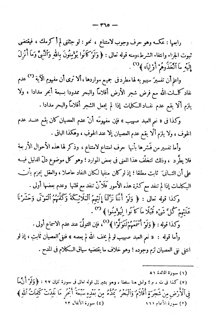 وأما تَفْسِيرِ مَنْ فَسَّرَهَا بِأَنَّهَا حَرْفُ امْتِنَاعٍ لِامْتِنَاعٍ وَذَكَرَ لَهَا هَذِهِ الْأَحْوَالَ الْأَرْبَعَةَ فَلَا يَطَّرِدُ وَذَلِكَ لِتَخَلُّفِ هَذَا الْمَعْنَى فِي بَعْضِ الْمَوَارِدِ وَهُوَ كُلُّ مَوْضُوعٍ دَلَّ الدَّلِيلُ فِيهِ عَلَى أَنَّ الثَّانِيَ ثَابِتٌ مُطْلَقًا إِذْ لَوْ كَانَ مَنْفِيًّا لَكَانَ النَّفَادُ حَاصِلًا وَالْعَقْلُ يَجْزِمُ بِأَنَّ الْكَلِمَاتِ إِذَا لَمْ تَنْفَدْ مَعَ كَثْرَةِ هَذِهِ الأمور فلأن تَنْفَدَ مَعَ قِلَّتِهَا وَعَدَمِ بَعْضِهَا أَوْلَى.
