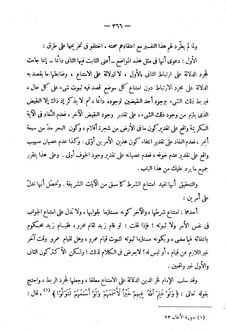 الْأَوَّلُ: دَعْوَى أَنَّهَا فِي مِثْلِ هَذِهِ الْمَوَاضِعِ أَعْنِي الثَّابِتَ فِيهَا الثَّانِي دَائِمًا إِنَّمَا جَاءَتْ لِمُجَرَّدِ الدَّلَالَةِ عَلَى ارْتِبَاطِ الثَّانِي بِالْأَوَّلِ لَا لِلدَّلَالَةِ عَلَى الِامْتِنَاعِ وَضَابِطُهَا مَا يُقْصَدُ بِهِ الدَّلَالَةُ عَلَى مُجَرَّدِ الِارْتِبَاطِ دُونَ امْتِنَاعِ كُلِّ مَوْضِعٍ قُصِدَ فِيهِ ثُبُوتُ شَيْءٍ عَلَى كُلِّ حَالٍ فَيُرْبَطُ ذَلِكَ الشَّيْءُ بِوُجُودِ أَحَدِ النَّقِيضَيْنِ لِوُجُودِهِ دَائِمًا ثُمَّ لَا يُذْكَرُ إِذْ ذَاكَ إِلَّا النَّقِيضُ الَّذِي يَلْزَمُ مِنْ وُجُودِ ذَلِكَ الشيء عَلَى تَقْدِيرِ وُجُودِ النَّقِيضِ الْآخَرِ فَعَدَمُ النَّفَادِ فِي الْآيَةِ الْكَرِيمَةِ وَاقِعٌ عَلَى تَقْدِيرِ كَوْنِ ما في الأرض من شجرة أقلام وكون البحر مد من سَبْعَةُ أَبْحُرٍ فَعَدَمُ النَّفَادِ عَلَى تَقْدِيرِ انْتِفَاءِ كَوْنِ هَذَيْنِ الْأَمْرَيْنِ أَوْلَى وَكَذَا عَدَمُ عِصْيَانِ صُهَيْبٍ وَاقِعٌ عَلَى تَقْدِيرِ عَدَمِ خَوْفِهِ فَعَدَمُ عِصْيَانِهِ عَلَى تَقْدِيرِ وُجُودِ الْخَوْفِ أَوْلَى وَعَلَى هَذَا يَتَقَرَّرُ جَمِيعُ مَا يَرِدُ عَلَيْكَ مِنْ هَذَا الْبَابِ.