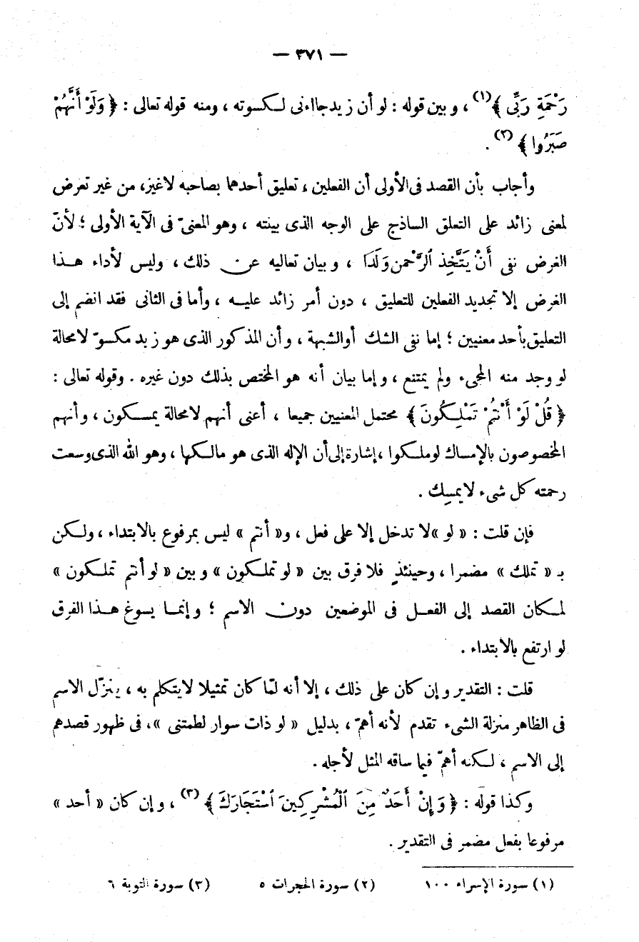 رحمة ربي} وَبَيْنَ قَوْلِهِ: لَوْ أَنَّ زَيْدًا جَاءَنِي لَكَسَوْتُهُ ومنه قوله تعالى: {ولو أنهم صبروا} .
