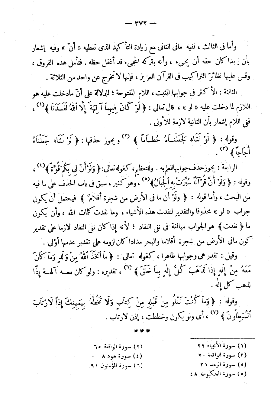 الرابعة: يجوز حذف جوابها للعلم وَلِلتَّعْظِيمِ كَقَوْلِهِ تَعَالَى: {لَوْ أَنَّ لِي بِكُمْ قُوَّةً} . وَقَوْلِهِ: {وَلَوْ أَنَّ قُرْآنًا سُيِّرَتْ بِهِ الْجِبَالُ} ،وَهُوَ كَثِيرٌ سَبَقَ فِي بَابِ الْحَذْفِ عَلَى مَا فِيهِ مِنَ الْبَحْثِ وَأَمَّا قَوْلُهُ: {وَلَوْ أَنَّ مَا فِي الْأَرْضِ مِنْ شَجَرَةٍ أَقْلَامٌ} فَيُحْتَمَلُ أَنْ يَكُونَ جَوَابُ لَوْ مَحْذُوفًا وَالتَّقْدِيرُ لَنَفِدَتْ هَذِهِ الْأَشْيَاءُ وَمَا نَفِدَتْ كَلِمَاتُ اللَّهِ وَأَنْ يَكُونَ {مَا نَفِدَتْ} هُوَ الْجَوَابَ مُبَالَغَةً فِي نَفْيِ النَّفَادِ لِأَنَّهُ إِذَا كَانَ نَفْيُ النَّفَادِ لَازِمًا عَلَى تَقْدِيرِ كَوْنِ مَا فِي الْأَرْضِ مِنْ شَجَرَةٍ أَقْلَامًا وَالْبَحْرِ مِدَادًا كَانَ لُزُومُهُ عَلَى تَقْدِيرِ عَدَمِهَا أَوْلَى.