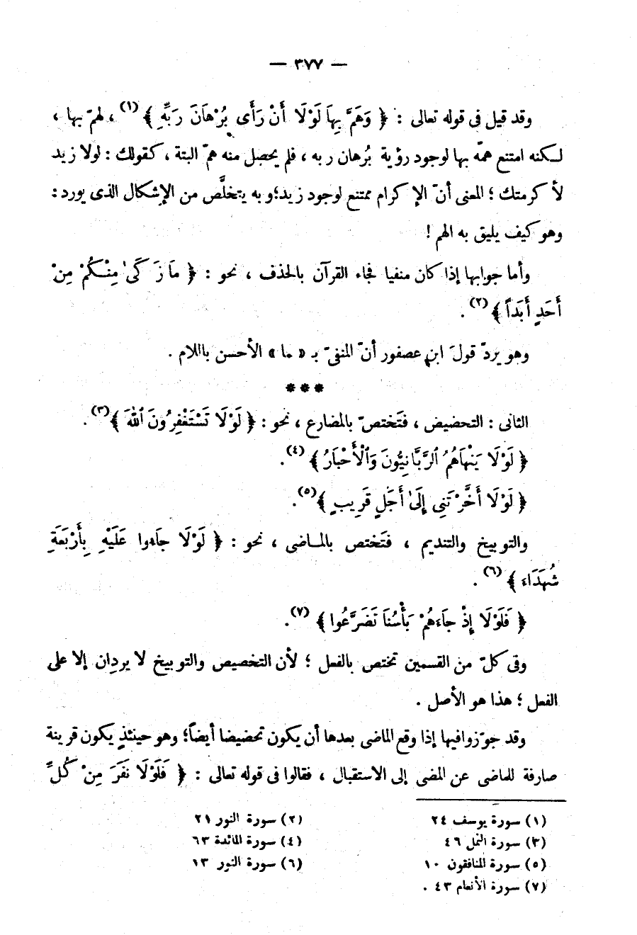 وَقَدْ قِيلَ: فِي قَوْلِهِ تَعَالَى: {وَهَمَّ بِهَا لَوْلَا أَنْ رَأَى بُرْهَانَ رَبِّهِ} . لَهَمَّ بِهَا لَكِنَّهُ امْتَنَعَ هَمُّهُ بِهَا لِوُجُودِ رُؤْيَةِ بُرْهَانِ رَبِّهِ فَلَمْ يَحْصُلْ مِنْهُ هَمٌّ أَلْبَتَّةَ كَقَوْلِكَ لَوْلَا زَيْدٌ لَأَكْرَمْتُكَ الْمَعْنَى أَنَّ الْإِكْرَامَ مُمْتَنِعٌ لِوُجُودِ زَيْدٍ وَبِهِ يُتَخَلَّصُ مِنَ الْإِشْكَالِ الَّذِي يُورَدُ وَهُوَ كَيْفَ يَلِيقُ بِهِ الْهَمُّ.