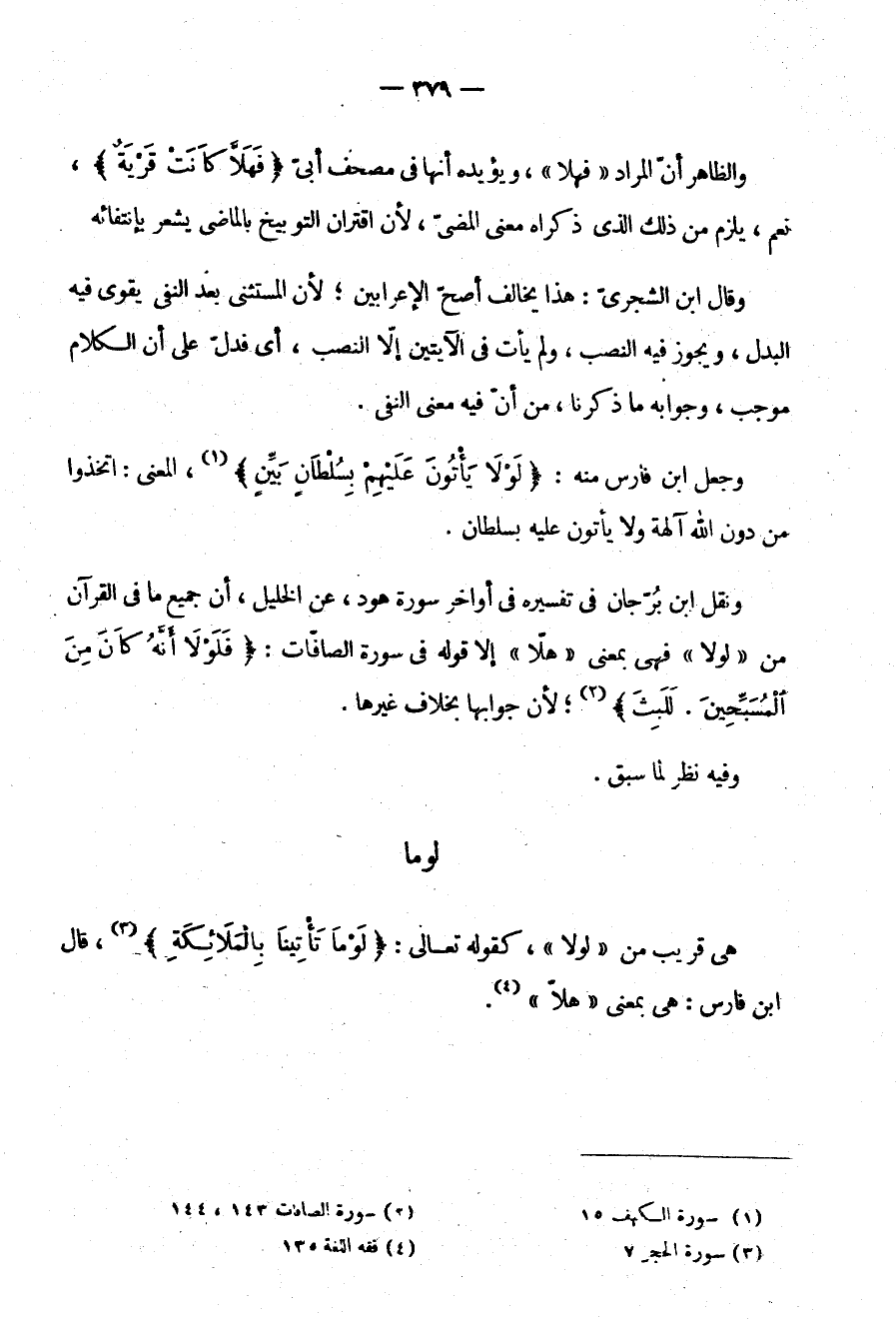 وَنَقَلَ ابْنُ بَرَّجَانَ فِي تَفْسِيرِهِ فِي أَوَاخِرِ سُورَةِ هُودٍ عَنِ الْخَلِيلِ أَنَّ جَمِيعَ مَا فِي الْقُرْآنِ مِنْ لَوْلَا فَهِيَ بِمَعْنَى هَلَّا إِلَّا قَوْلَهُ فِي سُورَةِ الصَّافَّاتِ: {فَلَوْلَا أَنَّهُ كَانَ مِنَ الْمُسَبِّحِينَ لَلَبِثَ} لِأَنَّ جَوَابَهَا بِخِلَافِ غَيْرِهَا.