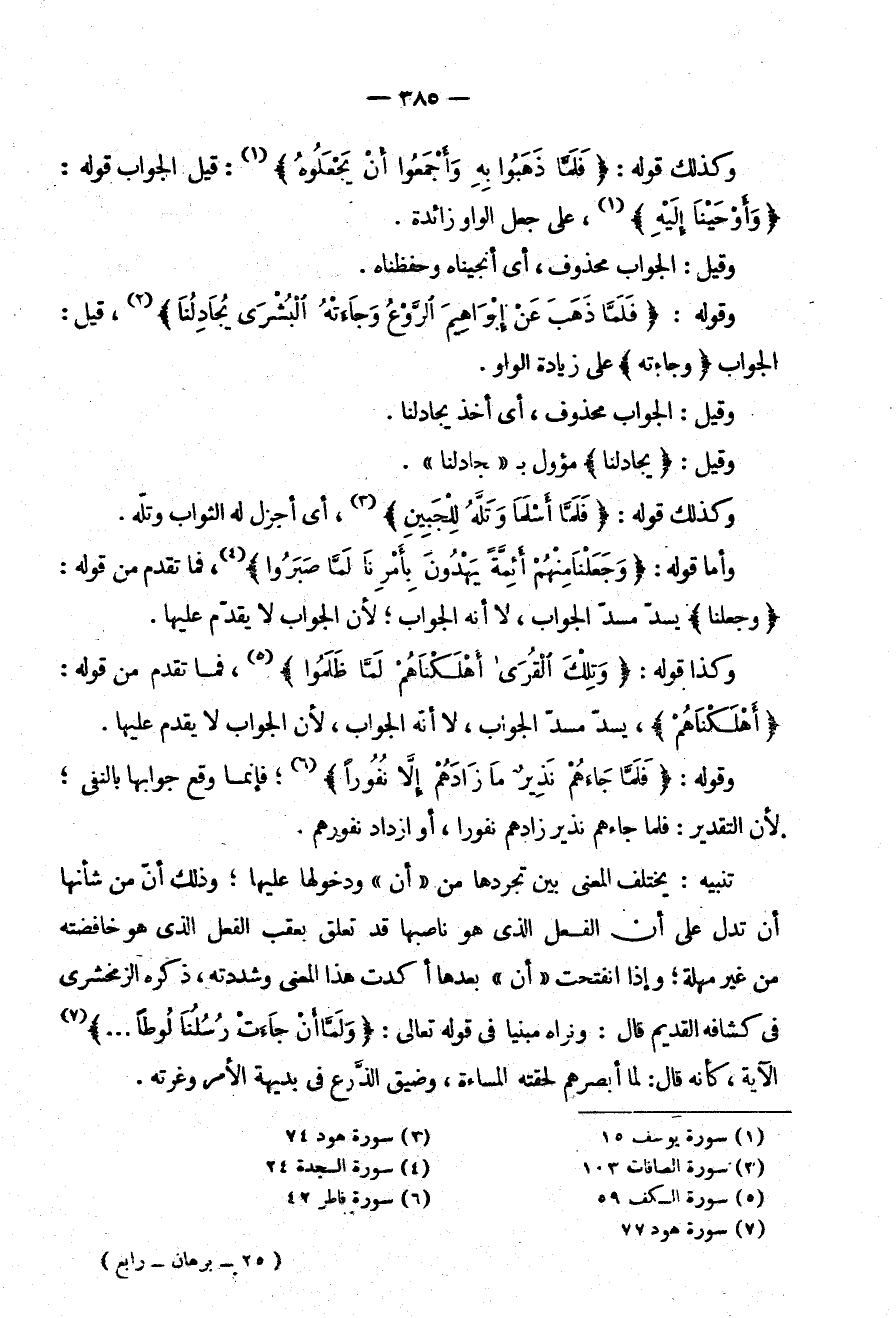 وَقِيلَ الْجَوَابُ مَحْذُوفٌ أَيْ أَخَذَ يُجَادِلُنَا وَقِيلَ: {يُجَادِلُنَا} مؤول بـ "جادلنا" وكذلك قوله: {فلما أسلما وتله للجبين} .