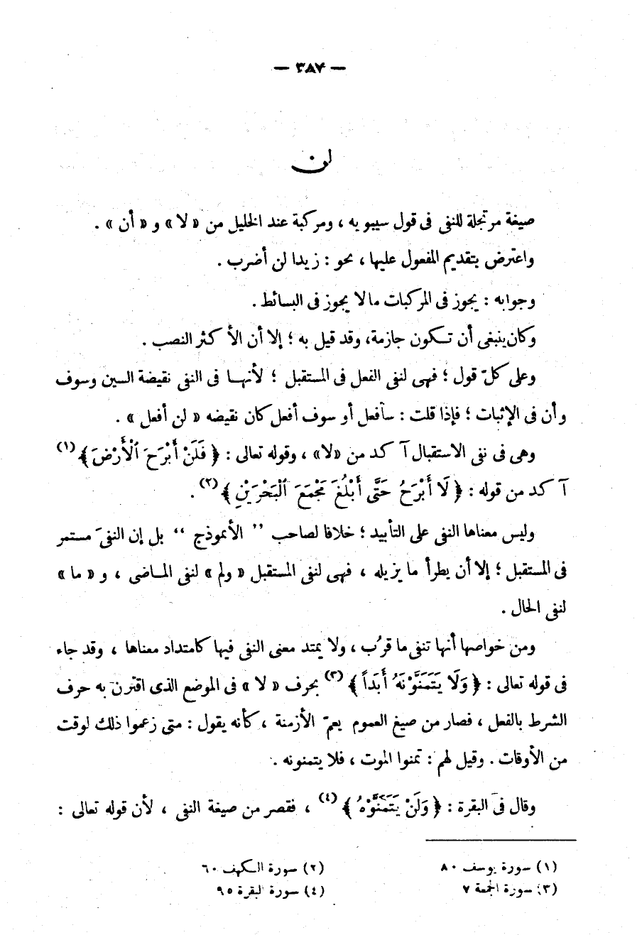 صِيغَةٌ مُرْتَجَلَةٌ لِلنَّفْيِ فِي قَوْلِ سِيبَوَيْهِ وَمُرَكَّبَةٌ عِنْدَ الْخَلِيلِ مِنْ لَا وَأَنْ وَاعْتُرِضَ بِتَقْدِيمِ الْمَفْعُولِ عَلَيْهَا نَحْوُ زَيْدًا لَنْ أَضْرِبَ