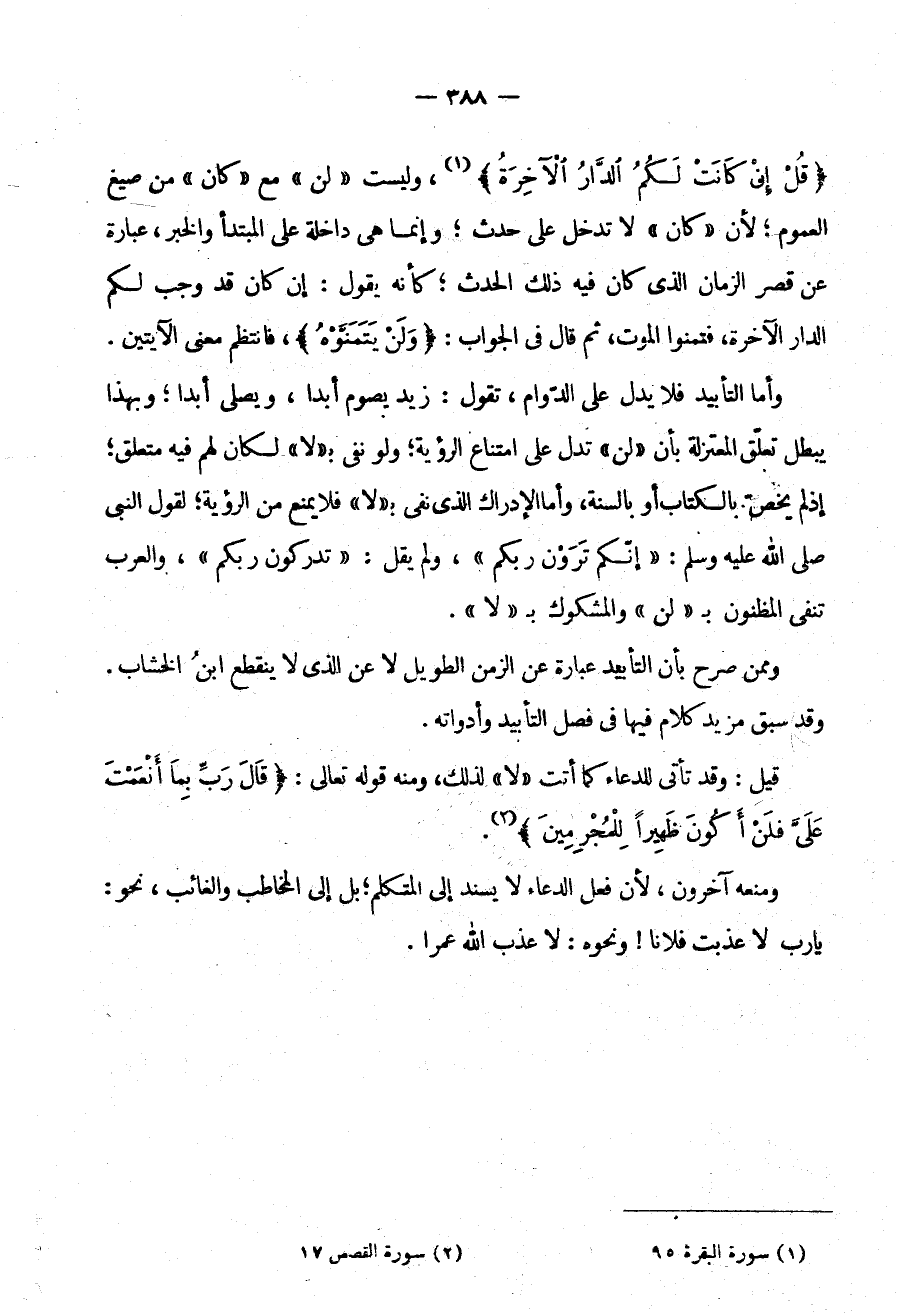 {قل إن كانت لكم الدار الآخرة} وَلَيْسَتْ لَنْ مَعَ كَانَ مِنْ صِيَغِ الْعُمُومِ لِأَنَّ كَانَ لَا تَدْخُلُ عَلَى حَدَثٍ وَإِنَّمَا هي داخلة على المبتدأ والخبر عِبَارَةٌ عَنْ قِصَرِ الزَّمَانِ الَّذِي كَانَ فِيهِ ذَلِكَ الْحَدَثُ كَأَنَّهُ يَقُولُ إِنْ كَانَ قَدْ وَجَبَ لَكُمُ الدَّارُ الْآخِرَةُ فَتَمَنَّوُا الْمَوْتَ ثُمَّ قَالَ فِي الْجَوَابِ: {وَلَنْ يَتَمَنَّوْهُ} فَانْتَظَمَ مَعْنَى الْآيَتَيْنِ وَأَمَّا التَّأْبِيدُ فَلَا يَدُلُّ عَلَى الدَّوَامِ تَقُولُ زَيْدٌ يَصُومُ أَبَدًا وَيُصَلِّي أَبَدًا وَبِهَذَا يَبْطُلُ تَعَلُّقُ الْمُعْتَزِلَةِ بِأَنَّ لَنْ تَدُلُّ عَلَى امتناع الرؤية ولو نفي بـ "لا" لَكَانَ لَهُمْ فِيهِ مُتَعَلَّقٌ إِذْ لَمْ يُخَصَّ بِالْكِتَابِ أَوْ بِالسُّنَّةِ وَأَمَّا الْإِدْرَاكُ الَّذِي نُفِيَ بـ "لا" فَلَا يَمْنَعُ مِنَ الرُّؤْيَةِ لِقَوْلِ النَّبِيِّ صَلَّى اللَّهُ عَلَيْهِ وَسَلَّمَ: "إِنَّكُمْ تَرَوْنَ رَبَّكُمْ" وَلَمْ يقل تدركون ربكم والعرب تنفي المظنون بـ "لن" والمشكوك بـ "لا".