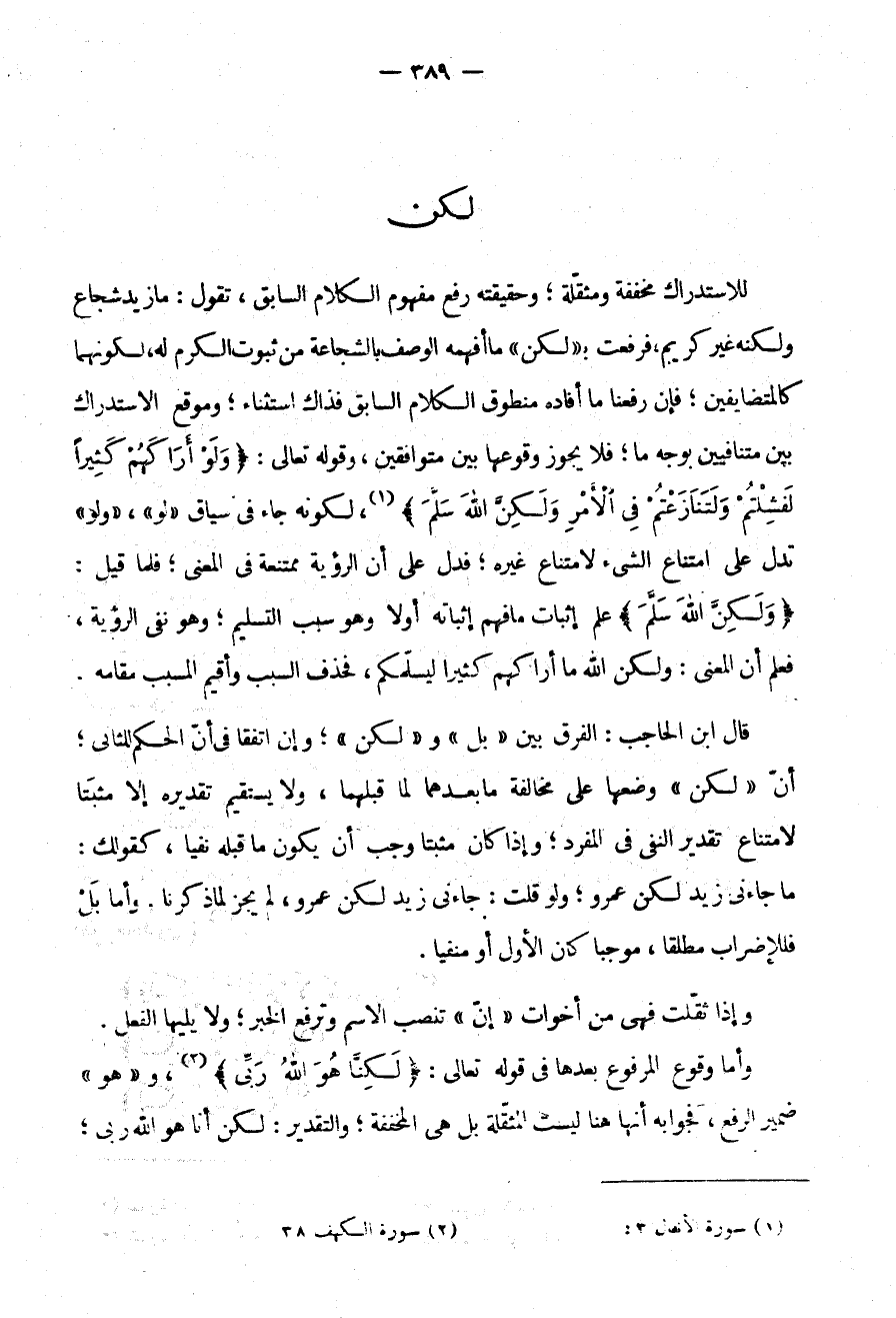 لِلِاسْتِدْرَاكِ مُخَفَّفَةٌ وَمُثَقَّلَةٌ وَحَقِيقَتُهُ رَفْعُ مَفْهُومِ الكلام السابق تقول ما زيد شجاع ولكنه غير كريم فرفعت بـ "لكن" مَا أَفْهَمَهُ الْوَصْفُ بِالشَّجَاعَةِ مِنْ ثُبُوتِ الْكَرَمِ لَهُ لِكَوْنِهِمَا كَالْمُتَضَايِفَيْنِ فَإِنْ رَفَعْنَا مَا أَفَادَهُ مَنْطُوقُ الْكَلَامِ السَّابِقِ فَذَاكَ اسْتِثْنَاءٌ وَمَوْقِعُ الِاسْتِدْرَاكِ بَيْنَ مُتَنَافِيَيْنِ بِوَجْهٍ مَا فَلَا يَجُوزُ وُقُوعُهَا بَيْنَ مُتَوَافِقَيْنِ وَقَوْلِهِ تَعَالَى: {وَلَوْ أَرَاكَهُمْ كَثِيرًا لَفَشِلْتُمْ وَلَتَنَازَعْتُمْ فِي الْأَمْرِ وَلَكِنَّ اللَّهَ سَلَّمَ} .