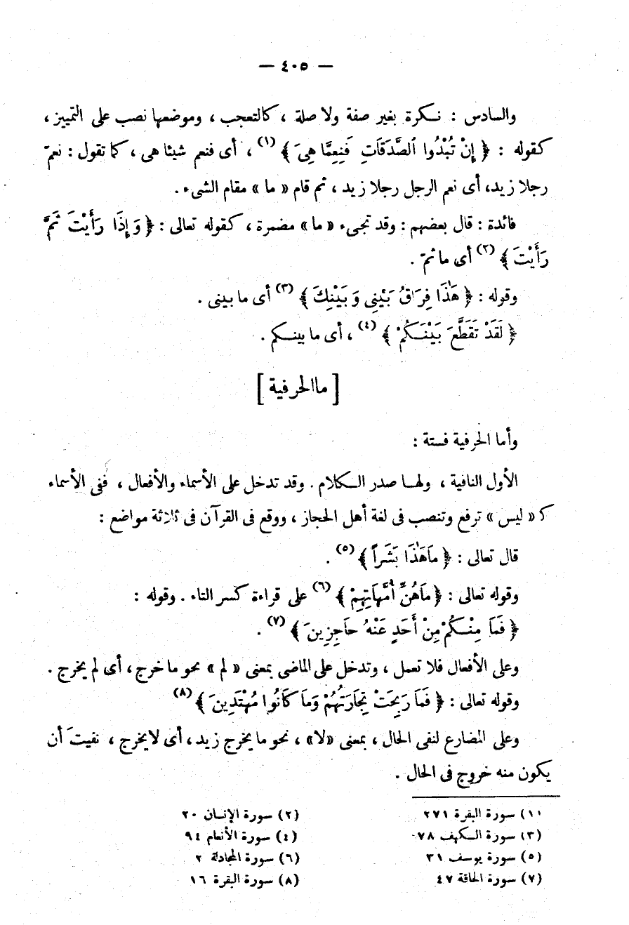 الْأَوَّلُ: النَّافِيَةُ وَلَهَا صَدْرُ الْكَلَامِ وَقَدْ تَدْخُلُ عَلَى الْأَسْمَاءِ وَالْأَفْعَالِ فَفِي الأسماء كـ "ليس" تَرْفَعُ وَتَنْصِبُ فِي لُغَةِ أَهْلِ الْحِجَازِ وَوَقَعَ فِي الْقُرْآنِ فِي ثَلَاثِ مَوَاضِعَ: