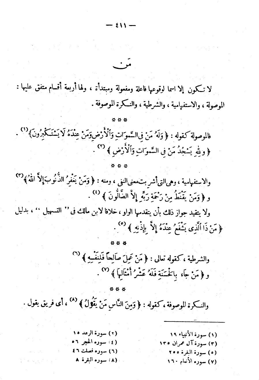 فَالْمَوْصُولَةُ كَقَوْلِهِ تعالى: {وَلَهُ مَنْ فِي السَّمَاوَاتِ وَالْأَرْضِ وَمَنْ عِنْدَهُ لا يستكبرون} {ولله يسجد من في السماوات والأرض}