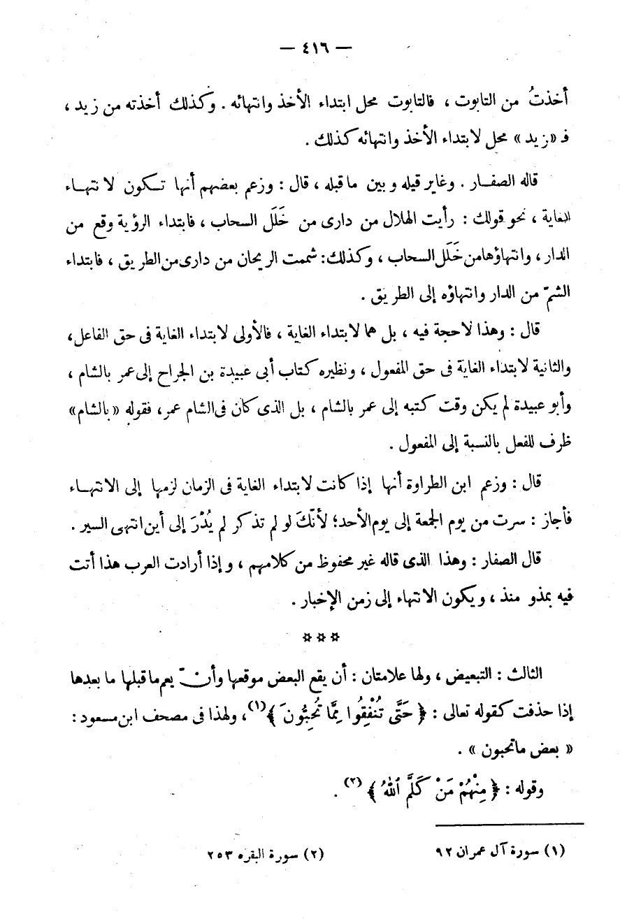 وقال: وَهَذَا لَا حُجَّةَ فِيهِ بَلْ هُمَا لِابْتِدَاءِ الْغَايَةِ فَالْأُولَى لِابْتِدَاءِ الْغَايَةِ فِي حَقِّ الْفَاعِلِ وَالثَّانِيَةُ لِابْتِدَاءِ الْغَايَةِ فِي حَقِّ الْمَفْعُولِ وَنَظِيرُهُ كِتَابُ أَبِي عُبَيْدَةَ بْنِ الْجَرَّاحِ إِلَى عُمَرَ بِالشَّامِ وَأَبُو عُبَيْدَةَ لَمْ يَكُنْ وَقْتَ كَتْبِهِ إِلَى عُمَرَ بِالشَّامِ بَلِ الَّذِي كَانَ فِي الشَّامِ عُمَرُ فَقَوْلُهُ بِالشَّامِ ظَرْفٌ لِلْفِعْلِ بِالنِّسْبَةِ إِلَى الْمَفْعُولِ.