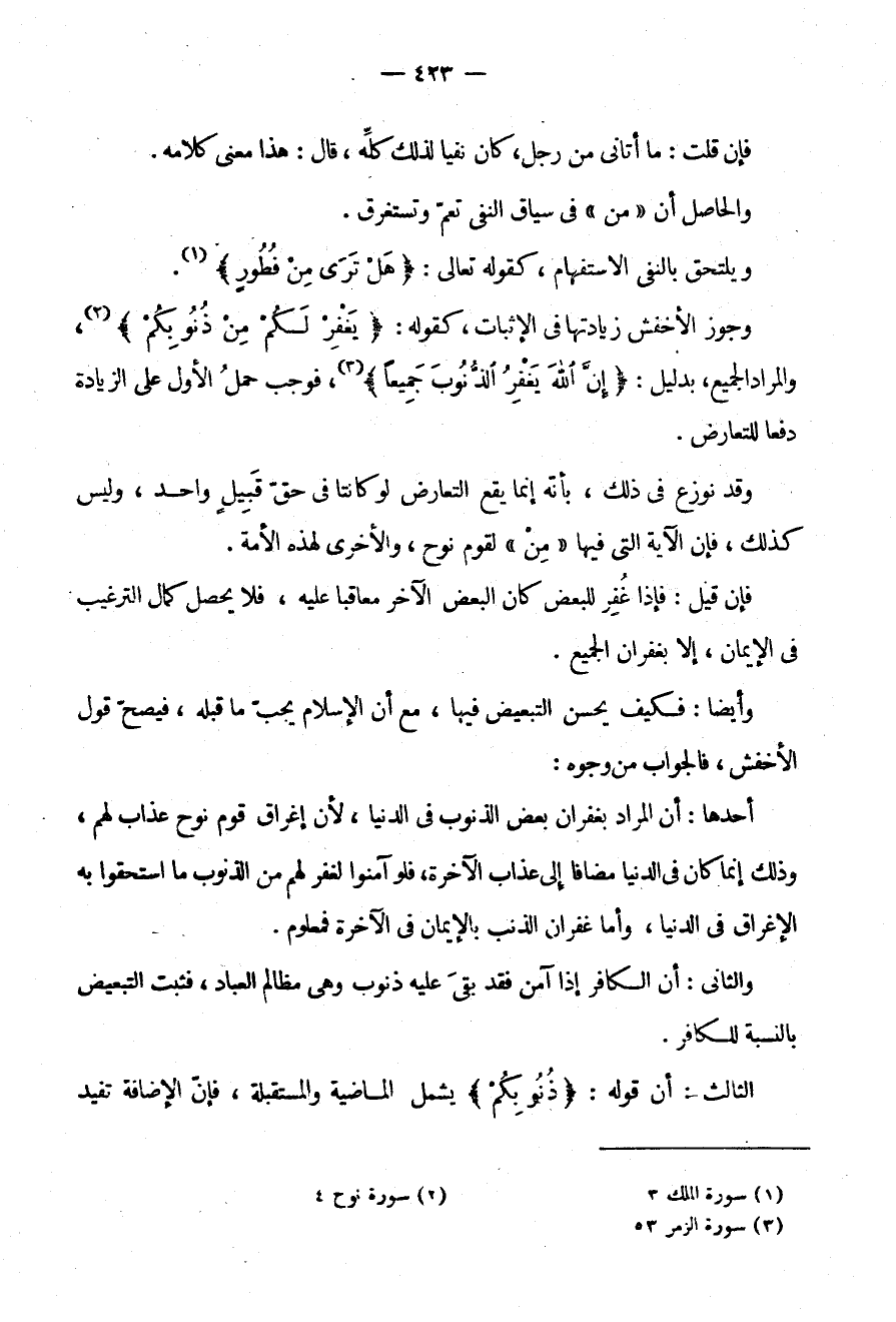 وَأَيْضًا: فَكَيْفَ يَحْسُنُ التَّبْعِيضُ فِيهَا مَعَ أَنَّ الْإِسْلَامَ يَجُبُّ مَا قَبْلَهُ فَيَصِحُّ قَوْلُ الْأَخْفَشِ فَالْجَوَابُ مِنْ وُجُوهٍ: