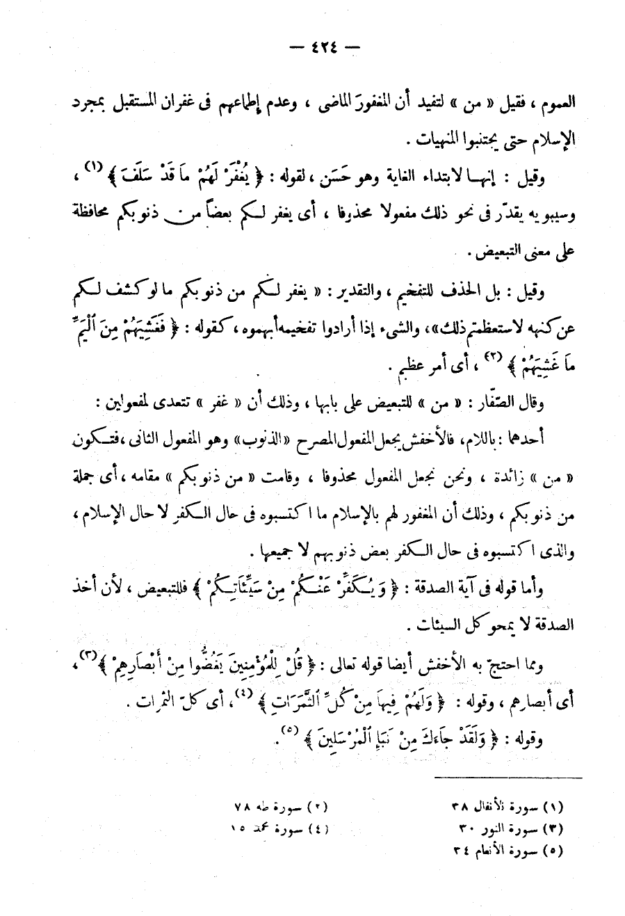 وَقَالَ الصَّفَّارُ: مِنْ لِلتَّبْعِيضِ عَلَى بَابِهَا وَذَلِكَ أَنَّ غَفَرَ تَتَعَدَّى لِمَفْعُولَيْنِ أَحَدُهُمَا بِاللَّامِ فَالْأَخْفَشُ يَجْعَلُ الْمَفْعُولَ الْمُصَرَّحَ الذُّنُوبَ وَهُوَ الْمَفْعُولُ الثَّانِي فَتَكُونُ مِنْ زَائِدَةً وَنَحْنُ نَجْعَلُ الْمَفْعُولَ مَحْذُوفًا وَقَامَتْ مِنْ ذُنُوبِكُمْ مَقَامَهُ أَيْ جُمْلَةً مِنْ ذُنُوبِكُمْ وَذَلِكَ أَنَّ الْمَغْفُورَ لَهُمْ بِالْإِسْلَامِ مَا اكْتَسَبُوهُ فِي حَالِ الْكُفْرِ لا حَالِ الْإِسْلَامِ وَالَّذِي اكْتَسَبُوهُ فِي حَالِ الْكُفْرِ بَعْضُ ذُنُوبِهِمْ لَا جَمِيعُهَا.