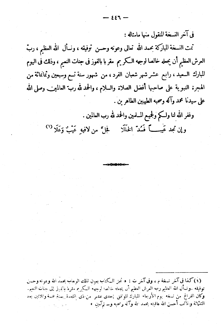 تَمَّتِ النُّسْخَةُ الْمُبَارَكَةُ بِحَمْدِ اللَّهِ تَعَالَى وَعَوْنِهِ وَحُسْنِ تَوْفِيقِهِ وَنَسْأَلُ اللَّهَ الْعَظِيمَ رَبَّ الْعَرْشِ الْعَظِيمِ أَنْ يَجْعَلَهُ خَالِصًا لِوَجْهِهِ الْكَرِيمِ مُقَرِّبًا بِالْفَوْزِ فِي جَنَّاتِ النَّعِيمِ وَذَلِكَ فِي الْيَوْمِ الْمُبَارَكِ السَّعِيدِ رَابِعَ عَشَرَ شَهْرِ شَعْبَانَ الْفَرْدِ مِنْ شُهُورِ سَنَةِ تِسْعٍ وَسَبْعِينَ وَثَمَانِمِائَةٍ مِنَ الْهِجْرَةِ النَّبَوِيَّةِ عَلَى صَاحِبِهَا أَفْضَلُ الصَّلَاةِ وَالسَّلَامِ والحمد الله رَبِّ الْعَالَمِينَ وَصَلَّى اللَّهُ عَلَى سَيِّدِنَا مُحَمَّدٍ وَآلِهِ وَصَحْبِهِ الطَّيِّبِينَ الطَّاهِرِينَ