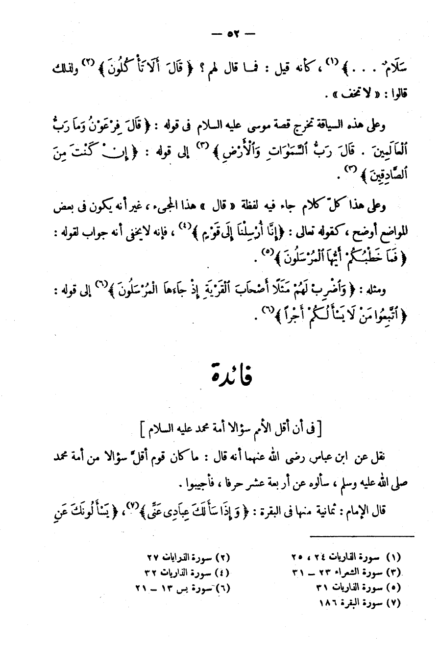 نُقِلَ عَنِ ابْنِ عَبَّاسٍ رَضِيَ اللَّهُ عَنْهُمَا أَنَّهُ قَالَ مَا كَانَ قَوْمٌ أَقَلَّ سُؤَالًا مِنْ أُمَّةِ مُحَمَّدٍ صَلَّى اللَّهُ عَلَيْهِ وَسَلَّمَ سَأَلُوهُ عَنْ أَرْبَعَةَ عَشَرَ حَرْفًا فَأُجِيبُوا