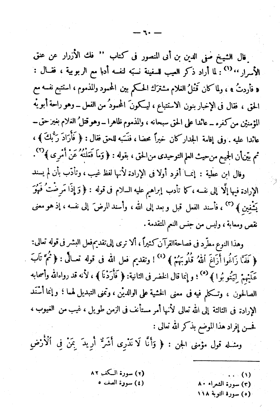 قَالَ الشَّيْخُ صَفِيُّ الدِّينِ بْنُ أَبِي الْمَنْصُورِ فِي كِتَابِ فَكُّ الْأَزْرَارِ عَنْ عُنُقِ الْأَسْرَارِ لَمَّا أَرَادَ ذِكْرَ الْعَيْبِ لِلسَّفِينَةِ نَسَبَهُ لِنَفْسِهِ أَدَبًا مَعَ الرُّبُوبِيَّةِ فَقَالَ فَأَرَدْتُ وَلَمَّا كَانَ قَتْلُ الْغُلَامِ مُشْتَرَكَ الْحُكْمِ بَيْنَ الْمَحْمُودِ وَالْمَذْمُومِ اسْتَتْبَعَ نَفْسَهُ مَعَ الْحَقِّ فَقَالَ فِي الْإِخْبَارِ بِنُونِ الِاسْتِتْبَاعِ لِيَكُونَ الْمَحْمُودُ مِنَ الْفِعْلِ وَهُوَ رَاحَةُ أَبَوَيْهِ الْمُؤْمِنَيْنِ مِنْ كُفْرِهِ عَائِدًا عَلَى الْحَقِّ سُبْحَانَهُ وَالْمَذْمُومُ ظَاهِرًا وَهُوَ قَتْلُ الْغُلَامِ بِغَيْرِ حَقٍّ عَائِدًا عَلَيْهِ وَفِي إِقَامَةِ الْجِدَارِ كَانَ خَيْرًا مَحْضًا فَنَسَبَهُ لِلْحَقِّ فَقَالَ {فَأَرَادَ رَبُّكَ} ثُمَّ بَيَّنَ أَنَّ الْجَمِيعَ مِنْ حَيْثُ الْعِلْمِ التَّوْحِيدِيِّ مِنَ الْحَقِّ بِقَوْلِهِ {وَمَا فَعَلْتُهُ عن أمري}