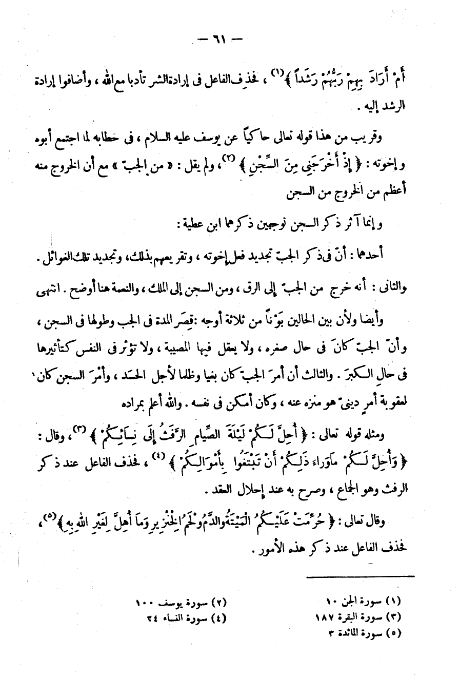 وَقَرِيبٌ مِنْ هَذَا قَوْلُهُ تَعَالَى حَاكِيًا عَنْ يُوسُفَ عَلَيْهِ السَّلَامُ فِي خِطَابِهِ لَمَّا اجْتَمَعَ أَبُوهُ وَإِخْوَتُهُ {إذ أخرجني من السجن} وَلَمْ يَقُلْ مِنَ الْجُبِّ مَعَ أَنَّ الْخُرُوجَ مِنْهُ أَعْظَمُ مِنَ الْخُرُوجِ مِنَ السِّجْنِ