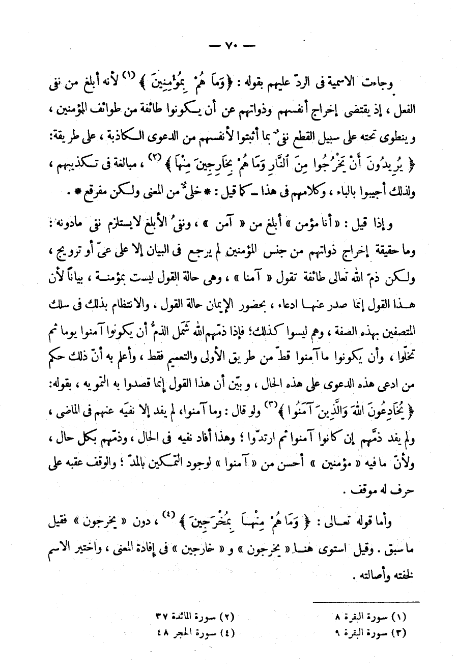وَإِذَا قِيلَ: أَنَا مُؤْمِنٌ أَبْلَغُ مَنْ آمَنَ وَنَفْيُ الْأَبْلَغِ لَا يَسْتَلْزِمُ نَفْيَ مَا دُونَهُ وَمَا حَقِيقَةُ إِخْرَاجِ ذَوَاتِهِمْ مِنْ جِنْسِ الْمُؤْمِنِينَ لَمْ يَرْجِعْ فِي الْبَيَانِ إِلَّا عَلَى عَيٍّ أَوْ تَرْوِيجٍ وَلَكِنْ ذَمَّ اللَّهُ تَعَالَى طَائِفَةً تَقُولُ آمَنَّا وَهِيَ حَالَةَ الْقَوْلِ لَيْسَتْ بِمُؤْمِنَةٍ بَيَانًا لِأَنَّ هَذَا الْقَوْلَ إِنَّمَا صَدَرَ عَنْهَا ادِّعَاءً بِحُضُورِ الْإِيمَانِ حَالَةَ الْقَوْلِ وَالِانْتِظَامِ بِذَلِكَ فِي سِلْكِ الْمُتَّصِفِينَ بِهَذِهِ الصِّفَةِ وَهُمْ لَيْسُوا كَذَلِكَ فَإِذَا ذَمَّهُمُ اللَّهُ شَمِلَ الذَّمُّ أَنْ يَكُونُوا آمَنُوا يَوْمًا ثُمَّ تَخَلَّوْا وَأَنْ يَكُونُوا مَا آمَنُوا قَطُّ مِنْ طَرِيقِ الْأَوْلَى وَالتَّعْمِيمِ فَقَطْ وَأَعْلَمُ بِهِ أَنَّ ذَلِكَ حُكْمُ مَنِ ادَّعَى هَذَا الدَّعْوَى عَلَى هَذِهِ الْحَالِ وَبَيْنَ أَنَّ هَذَا الْقَوْلَ إِنَّمَا قَصَدُوا بِهِ التَّمْوِيهَ بِقَوْلِهِ {يُخَادِعُونَ اللَّهَ وَالَّذِينَ آمَنُوا} وَلَوْ قَالَ وَمَا آمَنُوا لَمْ يَفِدْ إِلَّا نَفْيَهُ عَنْهُمْ فِي الْمَاضِي وَلَمْ يَفِدْ ذَمَّهُمْ إِنْ كَانُوا آمَنُوا ثُمَّ ارْتَدُّوا وَهَذَا أَفَادَ نَفْيَهُ فِي الْحَالِ وَذَمَّهُمْ بِكُلِّ حَالٍ وَلِأَنَّ مَا فِيهِ مُؤْمِنِينَ أَحْسَنُ مِنْ آمَنُوا لِوُجُودِ التَّمْكِينِ بِالْمَدِّ وَالْوَقْفَ عَقِبَهُ عَلَى حَرْفٍ لَهُ مَوْقِفٌ وَأَمَّا قَوْلُهُ تَعَالَى {وَمَا هُمْ مِنْهَا بمخرجين} دُونَ يَخْرُجُونَ فَقِيلَ مَا سَبَقَ وَقِيلَ اسْتَوَى هُنَا يَخْرُجُونَ وَخَارِجِينَ فِي إِفَادَةِ الْمَعْنَى وَاخْتِيرَ الِاسْمُ لِخِفَّتِهِ وَأَصَالَتِهِ