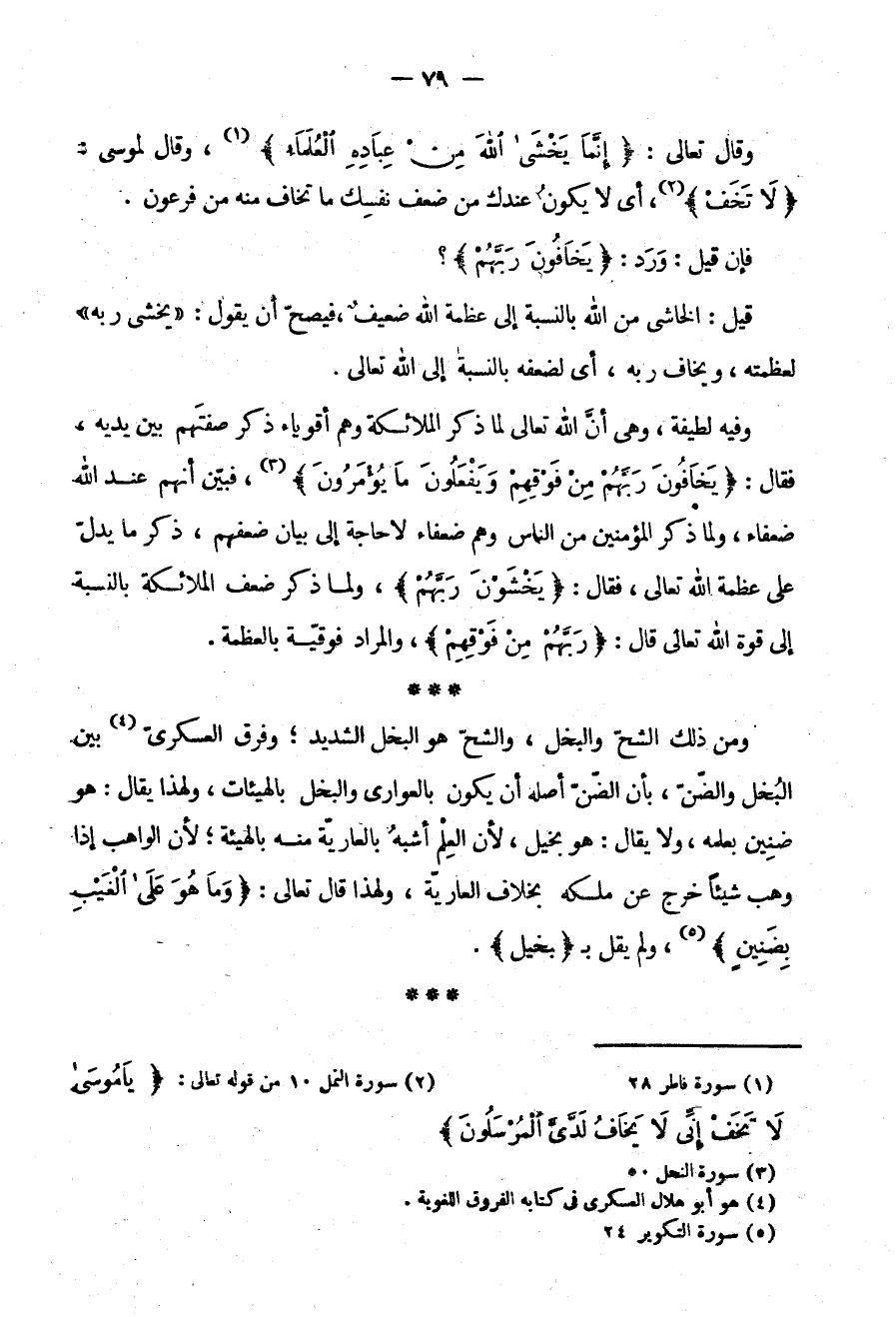 وَقَالَ تَعَالَى {إِنَّمَا يَخْشَى اللَّهَ مِنْ عِبَادِهِ العلماء} وقال لموسى {لا تخف} أَيْ لَا يَكُونُ عِنْدَكَ مِنْ ضَعْفِ نَفْسِكِ ما تخاف منه من فِرْعَوْنَ