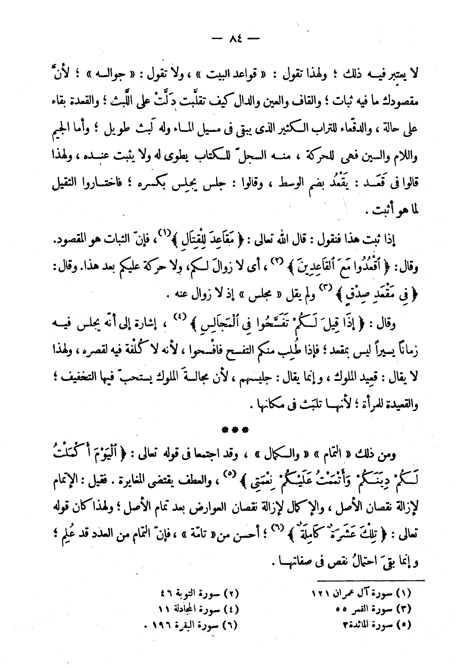 وَمِنْ ذَلِكَ التَّمَامُ وَالْكَمَالُ وَقَدِ اجْتَمَعَا فِي قَوْلِهِ تَعَالَى {الْيَوْمَ أَكْمَلْتُ لَكُمْ دِينَكُمْ وَأَتْمَمْتُ عَلَيْكُمْ نِعْمَتِي} وَالْعَطْفُ يَقْتَضِي الْمُغَايَرَةَ فَقِيلَ الْإِتْمَامُ لِإِزَالَةِ نُقْصَانِ الْأَصْلِ وَالْإِكْمَالُ لِإِزَالَةِ نُقْصَانِ الْعَوَارِضِ بَعْدَ تَمَامِ الْأَصْلِ وَلِهَذَا كَانَ قَوْلُهُ تَعَالَى {تِلْكَ عَشَرَةٌ كاملة} أَحْسَنُ مِنْ تَامَّةٌ فَإِنَّ التَّمَامَ مِنَ الْعَدَدِ قَدْ عُلِمَ وَإِنَّمَا بَقِيَ احْتِمَالُ نَقْصٍ فِي صفاتها
