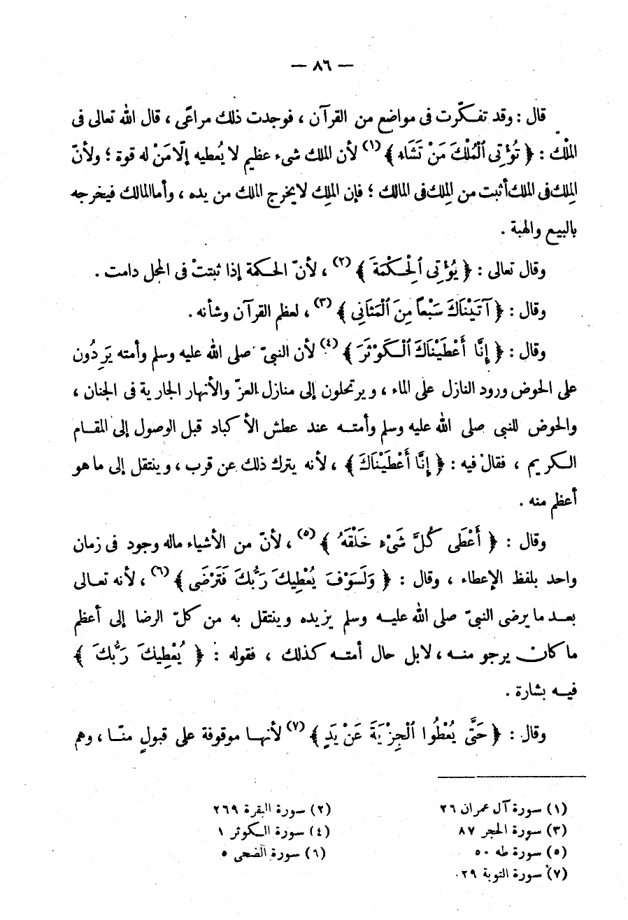 وَقَالَ: {أَعْطَى كُلَّ شَيْءٍ خلقه} لأن من الأشياء ماله وُجُودٌ فِي زَمَانٍ وَاحِدٍ بِلَفْظِ الْإِعْطَاءِ وَقَالَ {لسوف يعطيك ربك فترضى} لِأَنَّهُ تَعَالَى بَعْدَ مَا يُرْضِي النَّبِيَّ صَلَّى اللَّهُ عَلَيْهِ وَسَلَّمَ يَزِيدُهُ وَيَنْتَقِلُ بِهِ مِنْ كُلِّ الرِّضَا إِلَى أَعْظَمِ مَا كَانَ يَرْجُو مِنْهُ لَا بَلْ حَالُ أُمَّتِهِ كَذَلِكَ فَقَوْلُهُ: {يُعْطِيكَ رَبُّكَ} فِيهِ بِشَارَةٌ