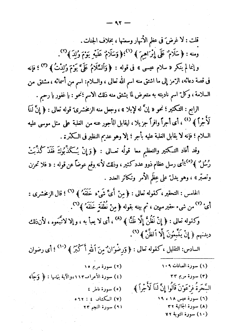 وكقوله تعالى: {إن نظن إلا ظنا} أَيْ لَا يُعْبَأُ بِهِ وَإِلَّا لَاتَّبَعُوهُ لِأَنَّ ذلك دينهم {إن يتبعون إلا الظن} السَّادِسُ: التَّقْلِيلُ كَقَوْلِهِ تَعَالَى {وَرِضْوَانٌ مِنَ اللَّهِ أكبر} أي رضوان
