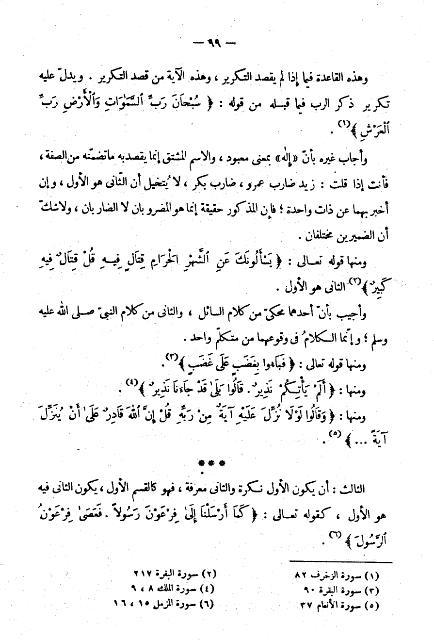 الثَّالِثُ: أَنْ يَكُونَ الْأَوَّلُ نَكِرَةً وَالثَّانِي مَعْرِفَةً فَهُوَ كَالْقِسْمِ الْأَوَّلِ يَكُونُ الثَّانِي فِيهِ هُوَ الْأَوَّلُ كَقَوْلِهِ تَعَالَى {كَمَا أَرْسَلْنَا إِلَى فِرْعَوْنَ رسولا فعصى فرعون الرسول}