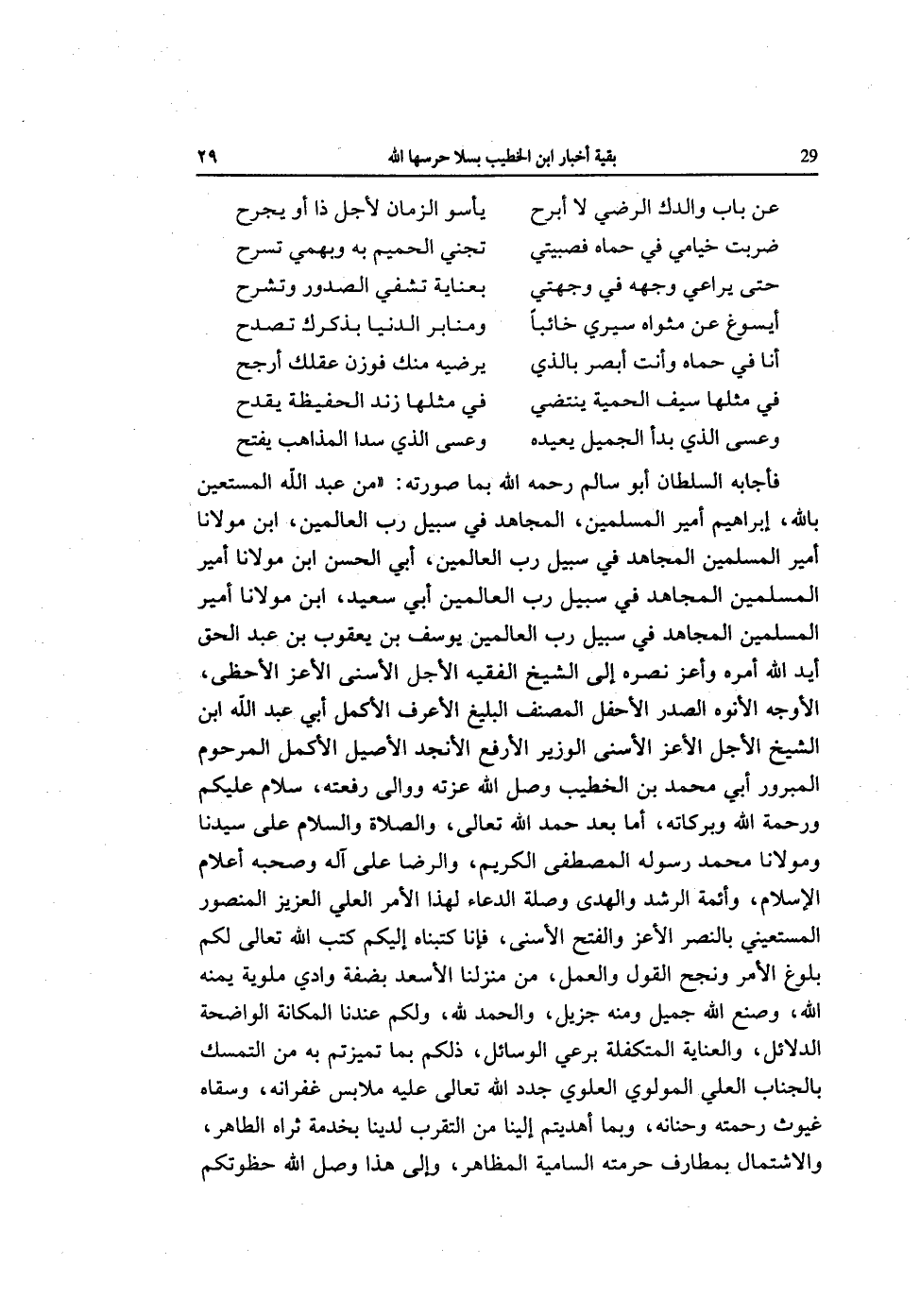 فَأَجَابَهُ السُّلْطَان أَبُو سَالم رَحمَه الله بِمَا صورته من عبد الله المستعين بِاللَّه إِبْرَاهِيم أَمِير الْمُسلمين الْمُجَاهِد فِي سَبِيل رب الْعَالمين ابْن مَوْلَانَا أَمِير الْمُسلمين الْمُجَاهِد فِي سَبِيل رب الْعَالمين أبي الْحسن ابْن مَوْلَانَا أَمِير الْمُسلمين الْمُجَاهِد فِي سَبِيل رب الْعَالمين أبي سعيد ابْن مَوْلَانَا أَمِير الْمُسلمين الْمُجَاهِد فِي سَبِيل رب الْعَالمين يُوسُف بن يَعْقُوب بن عبد الْحق أيد الله أمره وأعز نَصره إِلَى الشَّيْخ الْفَقِيه الْأَجَل الْأَسْنَى الْأَعَز الأحظى الْأَوْجه الأنوه الصَّدْر الأحفل المُصَنّف البليغ الأعرف الْأَكْمَل أبي عبد الله ابْن الشَّيْخ الْأَجَل الْأَعَز الْأَسْنَى الْوَزير الأرفع الأنجد الْأَصِيل الْأَكْمَل المرحوم المبرور أبي مُحَمَّد بن الْخَطِيب وصل الله عزته ووالى رفعته سَلام عَلَيْكُم وَرَحْمَة الله وَبَرَكَاته أما بعد حمد الله تَعَالَى وَصلى الله عَلَيْهِ وَسلم وَالرِّضَا على آله وَصَحبه أَعْلَام الْإِسْلَام وأئمة الرشد وَالْهدى وصلَة الدُّعَاء لهَذَا الْأَمر الْعلي الْعَزِيز الْمَنْصُور المستعيني بالنصر الْأَعَز وَالْفَتْح الْأَسْنَى فَإنَّا كتبناه إِلَيْكُم كتب الله تَعَالَى لكم بُلُوغ الْأَمر ونجح القَوْل وَالْعَمَل من منزلنا الأسعد بضفة وَادي ملوية يمنه الله وصنع الله جميل وَمِنْه جزيل وَالْحَمْد لله وَلكم عندنَا المكانة الْوَاضِحَة الدَّلَائِل والعناية المتكفلة برعي الْوَسَائِل ذَلِك بِمَا تميزتم بِهِ من التَّمَسُّك بالجناب الْعلي المولوي الْعلوِي جدد الله تَعَالَى عَلَيْهِ ملابس غفرانه وسقاه غيوث رَحمته وحنانه وَبِمَا أهديتم إِلَيْنَا من التَّقَرُّب لدينا بِخِدْمَة ثراه الطَّاهِر والاشتمال بمطارف حرمته السامية الْمظَاهر وَإِلَى هَذَا وصل الله حظوتكم