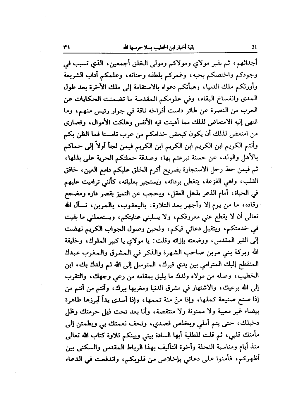 أجداثهم ثمَّ بِقَبْر مولَايَ ومولاكم وَمولى الْخلق أَجْمَعِينَ الَّذِي تسبب فِي وجودكم واختصكم بحبه وغمركم بِلُطْفِهِ وحنانه وعلمكم آدَاب الشَّرِيعَة وأورثكم ملك الدُّنْيَا وهيأتكم دَعْوَاهُ بالاستقامة إِلَى ملك الْآخِرَة بعد طول المدى وانفساخ الْبَقَاء وَفِي علومكم المقدسة مَا تَضَمَّنت الحكايات عَن الْعَرَب من النُّصْرَة عَن طَائِر داست أفراخه نَاقَة فِي جوَار رَئِيس مِنْهُم وَمَا انْتهى إِلَيْهِ الامتعاض لذَلِك مِمَّا أهينت فِيهِ الْأَنْفس وَهَلَكت الْأَمْوَال وقصارى من امتعض لذَلِك أَن يكون كبعض خدامكم من عرب تامسنا فَمَا الظَّن بكم وَأَنْتُم الْكَرِيم ابْن الْكَرِيم ابْن الْكَرِيم ابْن الْكَرِيم فِيمَن لَجأ أَولا إِلَى حماكم بالأهل وَالْولد عَن حَسَنَة تبرعتم بهَا وَصدقَة حملتكم الْحُرِّيَّة على بذلها ثمَّ فِيمَن حط رَحل الاستجارة بضريح أكْرم الْخلق عَلَيْكُم دامع الْعين خافق الْقلب واهي الفزعة يتغطى بردائه ويستجير بعليائه كأنني تراميت عَلَيْهِم فِي الْحَيَاة أَمَام الذعر يذهل الْعقل ويحجب عَن التميز بقصر دَاره ومضجع رقاده مَا من يَوْم إِلَّا وأجهر بعد التِّلَاوَة ياليعقوب يالمرين نسْأَل الله تَعَالَى أَن لَا يقطع عني معروفكم وَلَا يسلبني عنايتكم ويستعملني مَا بقيت فِي خدمتكم ويتقبل دعائي فِيكُم ولحين وُصُول الْجَواب الْكَرِيم نهضت إِلَى الْقَبْر الْمُقَدّس وَوَضَعته بإزائه وَقلت يَا مولَايَ يَا كَبِير الْمُلُوك وَخَلِيفَة الله وبركة بني مرين صَاحب الشُّهْرَة وَالذكر فِي الْمشرق وَالْمغْرب عَبدك الْمُنْقَطع إِلَيْك المترامي بَين يَدي قبرك المتوسل إِلَى الله ثمَّ ولدك بك ابْن الْخَطِيب وَصله من مَوْلَاهُ ولدك مَا يَلِيق بمقامه من رعي وَجهك والتقرب إِلَى الله برعيك والاشتهار فِي مشرق الدُّنْيَا وَمَغْرِبهَا ببرك وَأَنْتُم من أَنْتُم من إِذا صنع صَنِيعه كملها وَإِذا من منَّة تممها وَإِذا أسدى يدا أبرزها طَاهِرَة بَيْضَاء غير مَعِيبَة وَلَا ممنونة وَلَا منتقصة وَأَنا بعد تَحت ذيل حرمتك وظل دخيلك حَتَّى يتم أملي ويخلص قصدي وتحف نِعْمَتك بِي ويطمئن إِلَى مأمنك قلبِي ثمَّ قلت للطلبة أَيهَا السَّادة بيني وَبَيْنكُم تِلَاوَة كتاب الله تَعَالَى مُنْذُ أَيَّام ومناسبة النحلة وأخوة التَّأْلِيف بِهَذَا الرِّبَاط الْمُقَدّس وَالسُّكْنَى بَين أظْهركُم فَأمنُوا على دعائي بإخلاص من قُلُوبكُمْ واندفعت فِي الدُّعَاء