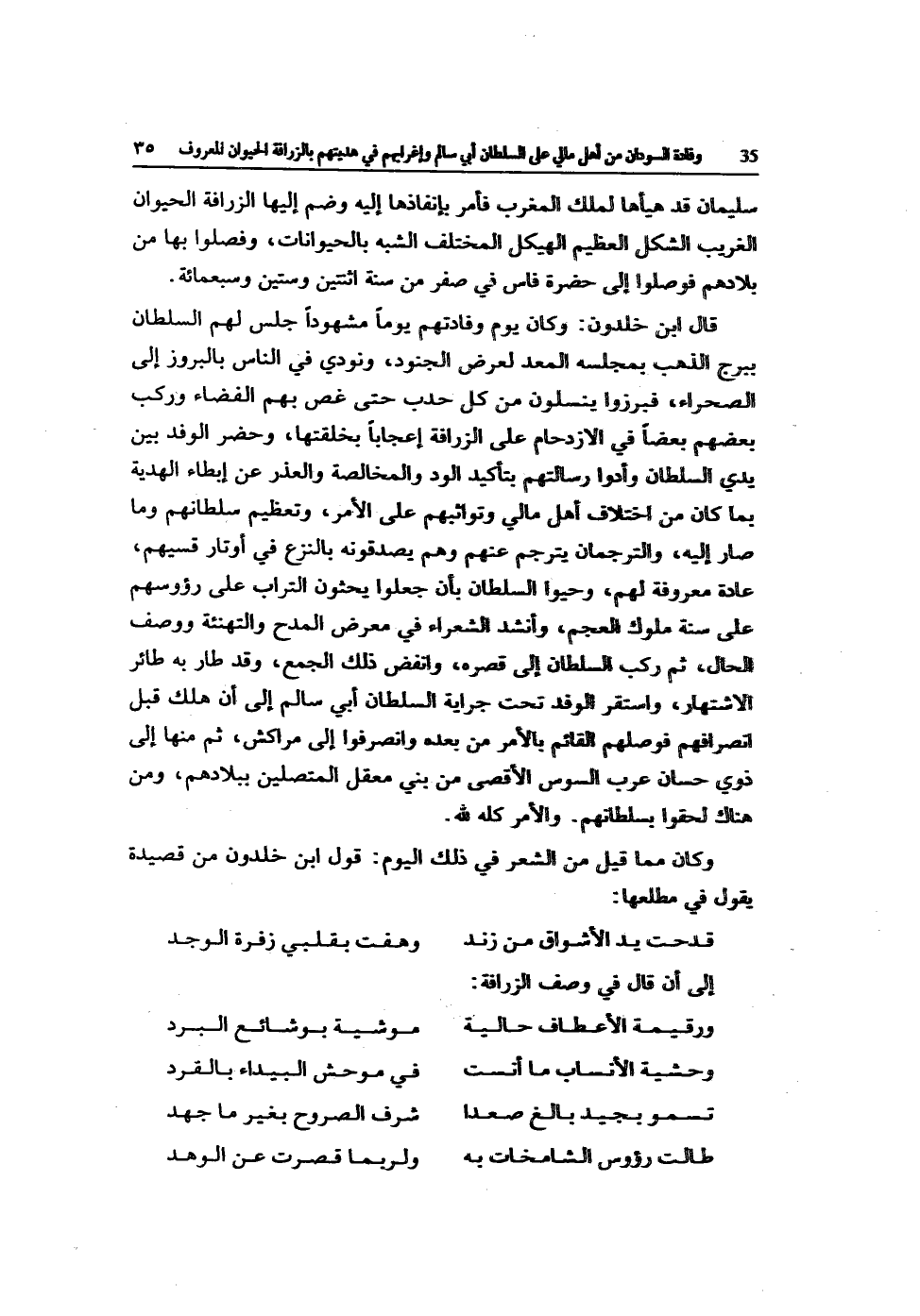 سُلَيْمَان قد هيأها لملك الْمغرب فَأمر بإنفاذها إِلَيْهِ وَضم إِلَيْهَا الزرافة الْحَيَوَان الْغَرِيب الشكل الْعَظِيم الهيكل الْمُخْتَلف الشّبَه بالحيوانات وفصلوا بهَا من بِلَادهمْ فوصلوا إِلَى حَضْرَة فاس فِي صفر من سنة اثْنَتَيْنِ وَسِتِّينَ وَسَبْعمائة