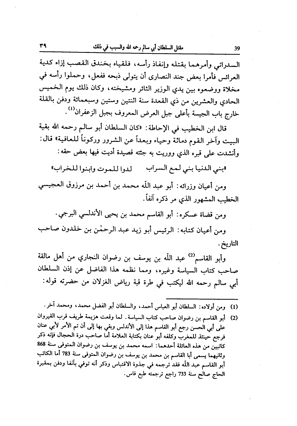 السدراتي وَأَمرهمَا بقتْله وإنفاذ رَأسه فلقياه بخندق الْقصب إزاء كدية العرائس فأمرا بعض جند النَّصَارَى أَن يتَوَلَّى ذبحه فَفعل وحملوا رَأسه فِي مخلاة ووضعوه بَين يَدي الْوَزير الثائر ومشيخته وَكَانَ ذَلِك يَوْم الْخَمِيس الْحَادِي وَالْعِشْرين من ذِي الْقعدَة سنة اثْنَتَيْنِ وَسِتِّينَ وَسَبْعمائة وَدفن بالقلة خَارج بَاب الجيسة بِأَعْلَى جبل الْعرض الْمَعْرُوف بجبل الزَّعْفَرَان