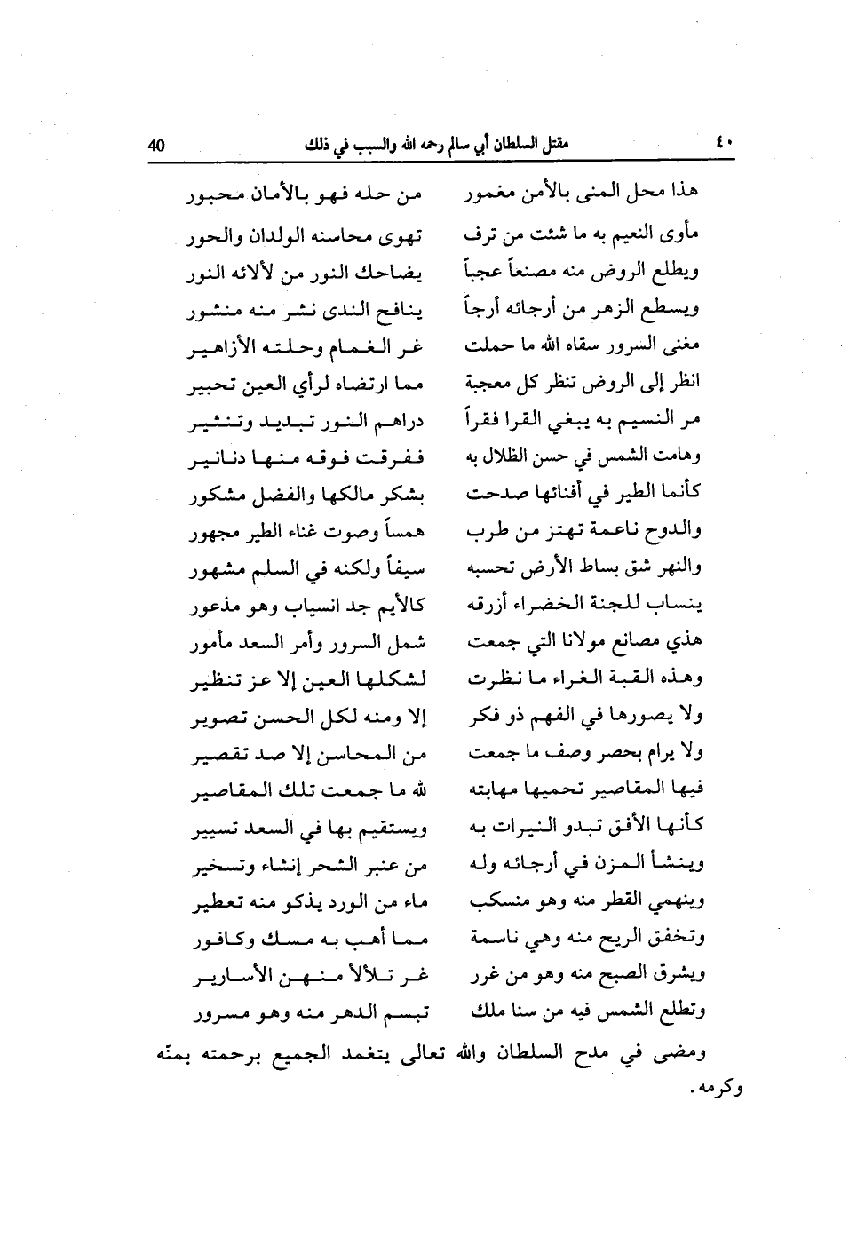 وَمضى فِي مدح السُّلْطَان وَالله تَعَالَى يتغمد الْجَمِيع برحمته بمنه وَكَرمه