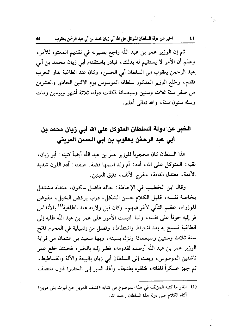 الْخَبَر عَن دولة السُّلْطَان المتَوَكل على الله أبي زيان مُحَمَّد بن أبي عبد الرَّحْمَن يَعْقُوب بن أبي الْحسن المريني