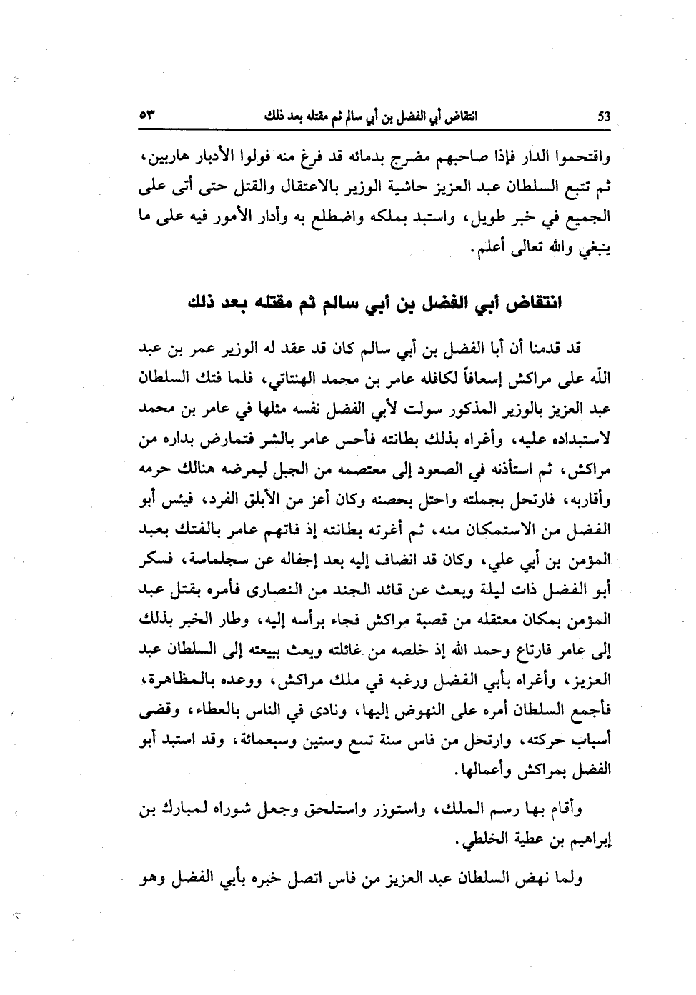 واقتحموا الدَّار فَإِذا صَاحبهمْ مضرج بدمائه قد فرغ مِنْهُ فَوَلوا الأدبار هاربين ثمَّ تتبع السُّلْطَان عبد الْعَزِيز حَاشِيَة الْوَزير بالاعتقال وَالْقَتْل حَتَّى أَتَى على الْجَمِيع فِي خبر طَوِيل واستبد بِملكه واضطلع بِهِ وأدار الْأُمُور فِيهِ على مَا يَنْبَغِي وَالله تَعَالَى أعلم