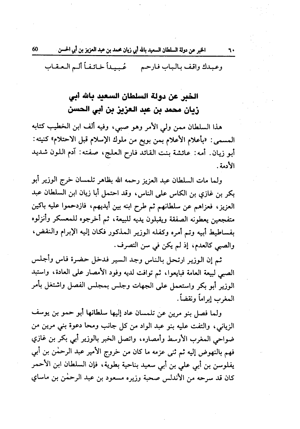 الْخَبَر عَن دولة السُّلْطَان السعيد بِاللَّه أبي زيان مُحَمَّد بن عبد الْعَزِيز بن أبي الْحسن