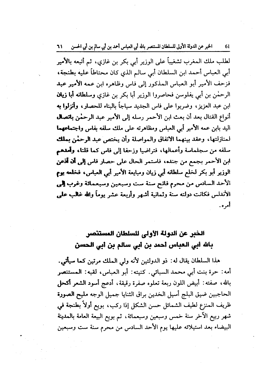 الْخَبَر عَن الدولة الأولى للسُّلْطَان الْمُسْتَنْصر بِاللَّه أبي الْعَبَّاس أَحْمد بن أبي سَالم بن أبي الْحسن