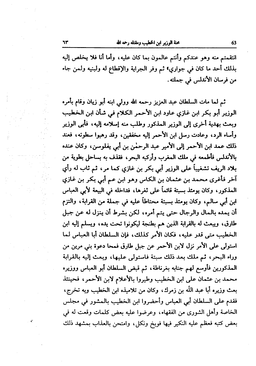 ثمَّ لما مَاتَ السُّلْطَان عبد الْعَزِيز رَحمَه الله وَولي ابْنه أَبُو زيان وَقَامَ بأَمْره الْوَزير أَبُو بكر ابْن غَازِي عاود ابْن الْأَحْمَر الْكَلَام فِي شَأْن ابْن الْخَطِيب وَبعث بهدية أُخْرَى إِلَى الْوَزير الْمَذْكُور وَطلب مِنْهُ إِسْلَامه إِلَيْهِ فَأبى الْوَزير وأساء الرَّد وعادت رسل ابْن الْأَحْمَر إِلَيْهِ مخفقين وَقد رهبوا سطوته فَعِنْدَ ذَلِك عمد ابْن الْأَحْمَر إِلَى الْأَمِير عبد الرَّحْمَن بن أبي يفلوسن وَكَانَ عِنْده بالأندلس فأطمعه فِي ملك الْمغرب وأركبه الْبَحْر فقذف بِهِ بساحل بطوية من بِلَاد الرِّيف تشغيبا على الْوَزير أبي بكر بن غَازِي كَمَا مر ثمَّ ثاب لَهُ رَأْي آخر فأغرى مُحَمَّد بن عُثْمَان بن الكاس وَهُوَ ابْن عَم أبي بكر بن غَازِي الْمَذْكُور وَكَانَ يَوْمئِذٍ بسبتة قَائِما على ثغرها فداخله فِي الْبيعَة لأبي الْعَبَّاس ابْن أبي سَالم وَكَانَ يَوْمئِذٍ بسبتة محتاطا عَلَيْهِ فِي جملَة من الْقَرَابَة وَالْتزم أَن يمده بِالْمَالِ وَالرِّجَال حَتَّى يتم أمره لَكِن بِشَرْط أَن ينزل لَهُ عَن جبل طَارق وَيبْعَث لَهُ بِالْقَرَابَةِ الَّذين هم بطنجة ليكونوا تَحت يَده وَيسلم إِلَيْهِ ابْن الْخَطِيب مَتى قدر عَلَيْهِ فَكَانَ الْأَمر كَذَلِك فَإِن السُّلْطَان أَبَا الْعَبَّاس لما استولى على الْأَمر نزل لِابْنِ الْأَحْمَر عَن جبل طَارق فمحا دَعْوَة بني مرين من وَرَاء الْبَحْر ثمَّ ملك بعد ذَلِك سبتة فاستولى عَلَيْهَا وَبعث إِلَيْهِ بِالْقَرَابَةِ الْمَذْكُورين فأوسع لَهُم جنابه بغرناطة ثمَّ قبض السُّلْطَان أَبُو الْعَبَّاس ووزيره مُحَمَّد بن عُثْمَان على ابْن الْخَطِيب وطيروا بالأعلام لِابْنِ الْأَحْمَر فَحِينَئِذٍ بعث وزيره أَبَا عبد الله بن زمرك وَكَانَ من تلاميذه ابْن الْخَطِيب وَبِه تخرج فَقدم على السُّلْطَان أبي الْعَبَّاس وأحضروا ابْن الْخَطِيب بالمشور فِي مجْلِس الْخَاصَّة وَأهل الشورى من الْفُقَهَاء وعرضوا عَلَيْهِ بعض كَلِمَات وَقعت لَهُ فِي بعض كتبه فَعظم عَلَيْهِ النكير فِيهَا فوبخ وَنكل وامتحن بِالْعَذَابِ بمشهد ذَلِك