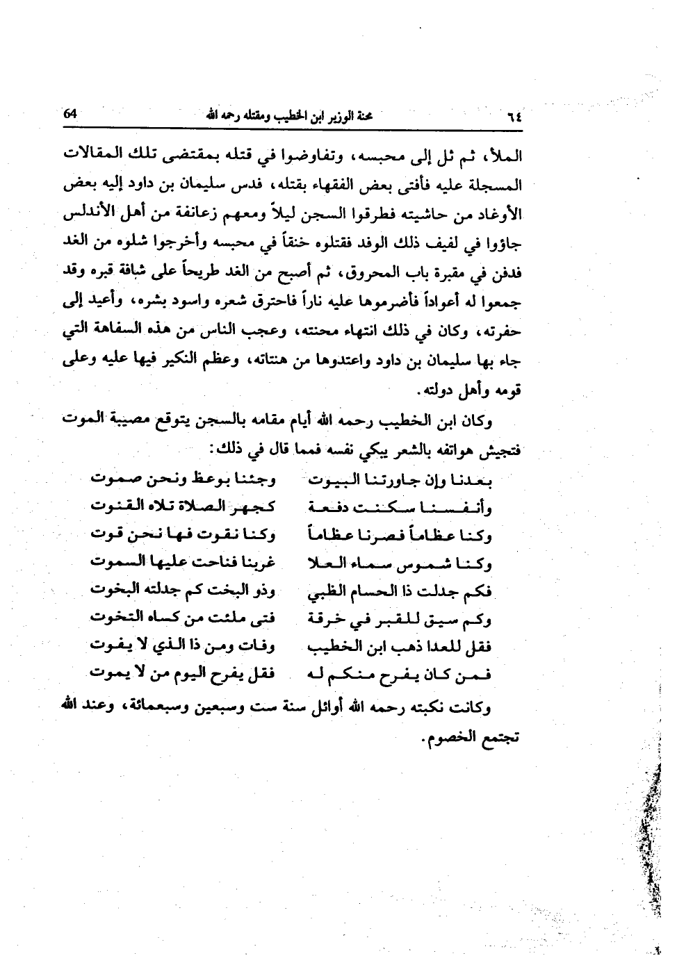 وَكَانَ ابْن الْخَطِيب رَحمَه الله أَيَّام مقَامه بالسجن يتَوَقَّع مُصِيبَة الْمَوْت فتجيش هواتفه بالشعر يبكي نَفسه فمما قَالَ فِي ذَلِك