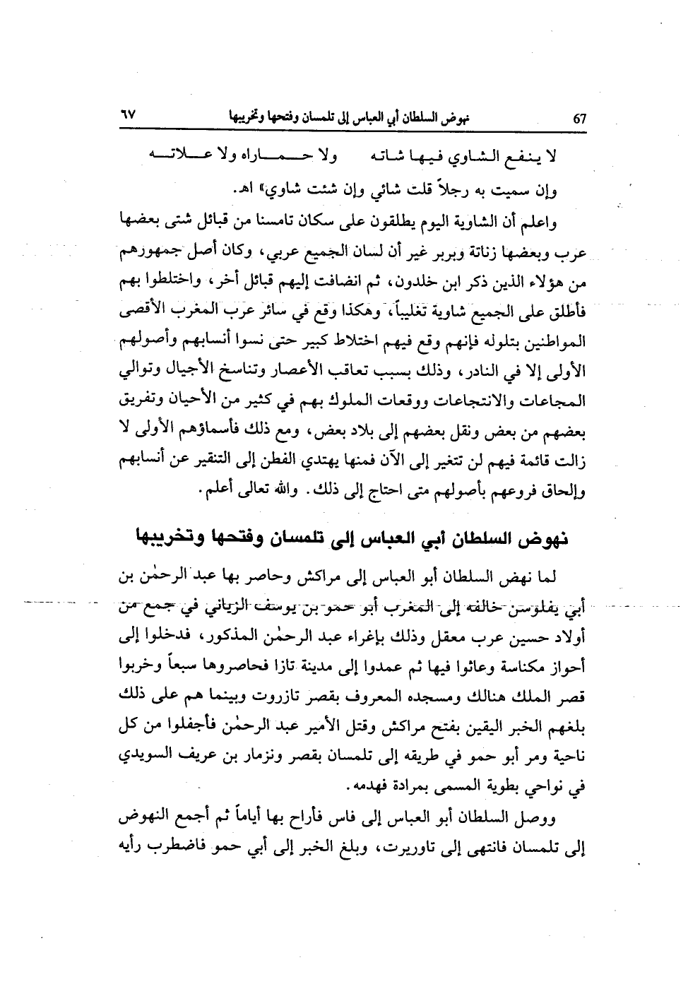 وَاعْلَم أَن الشاوية الْيَوْم يطلقون على سكان تامسنا من قبائل شَتَّى بَعْضهَا عرب وَبَعضهَا زناتة وبربر غير أَن لِسَان الْجَمِيع عَرَبِيّ وَكَانَ أصل جمهورهم من هَؤُلَاءِ الَّذين ذكر ابْن خلدون ثمَّ انضافت إِلَيْهِم قبائل أخر واختلطوا بهم فَأطلق على الْجَمِيع شاوية تَغْلِيبًا وَهَكَذَا وَقع فِي سَائِر عرب الْمغرب الْأَقْصَى المواطنين بتلوله فَإِنَّهُم وَقع فيهم اخْتِلَاط كَبِير حَتَّى نسوا أنسابهم وأصولهم الأولى إِلَّا فِي النَّادِر وَذَلِكَ بِسَبَب تعاقب الْأَعْصَار وتناسخ الأجيال وتوالي المجاعات والانتجاعات ووقعات الْمُلُوك بهم فِي كثير من الأحيان وتفريق بَعضهم من بعض وَنقل بَعضهم إِلَى بِلَاد بعض وَمَعَ ذَلِك فأسماؤهم الأولى لَا زَالَت قَائِمَة فيهم لن تَتَغَيَّر إِلَى الْآن فَمِنْهَا يَهْتَدِي الفطن إِلَى التنقير عَن أنسابهم وإلحاق فروعهم بأصولهم مَتى احْتَاجَ إِلَى ذَلِك وَالله تَعَالَى أعلم