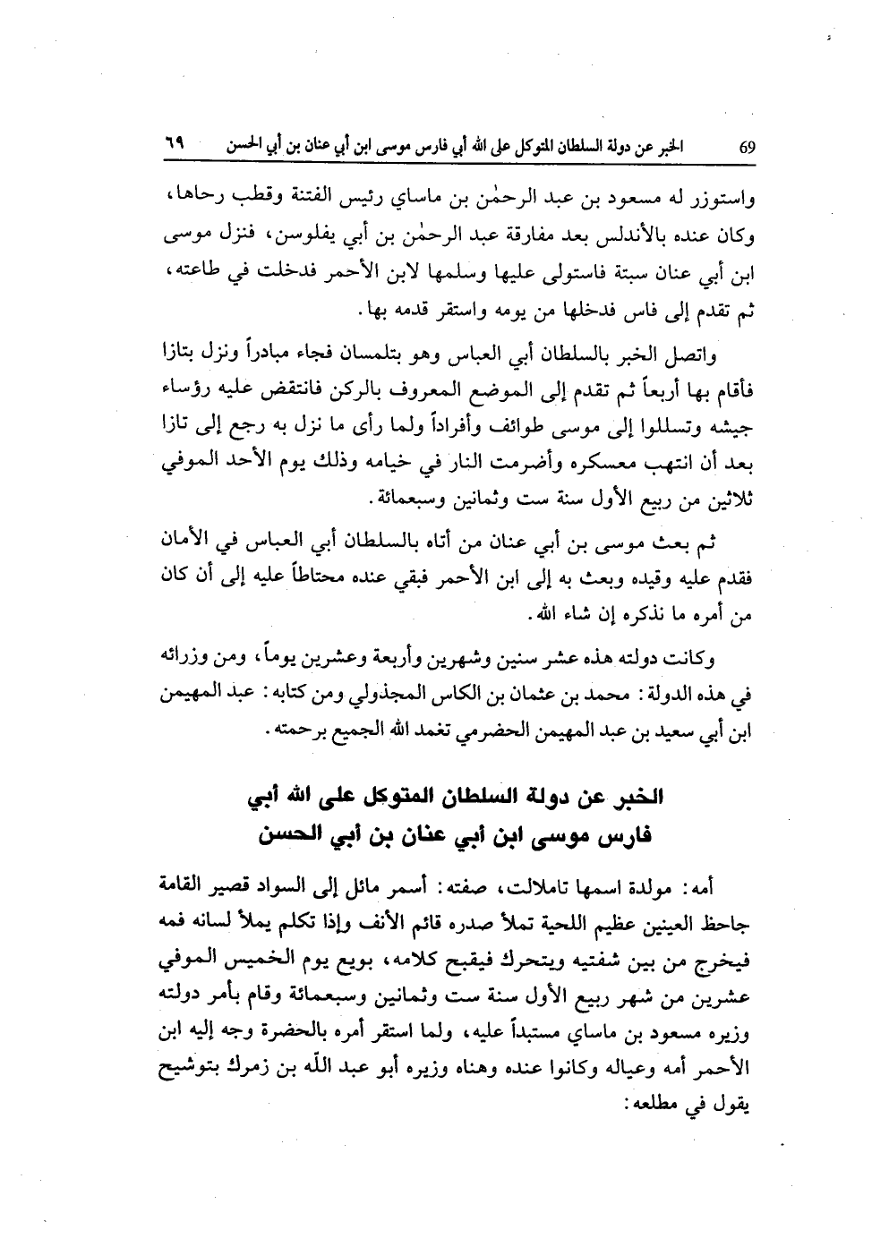 الْخَبَر عَن دولة السُّلْطَان المتَوَكل على الله أبي فَارس مُوسَى ابْن أبي عنان بن أبي الْحسن