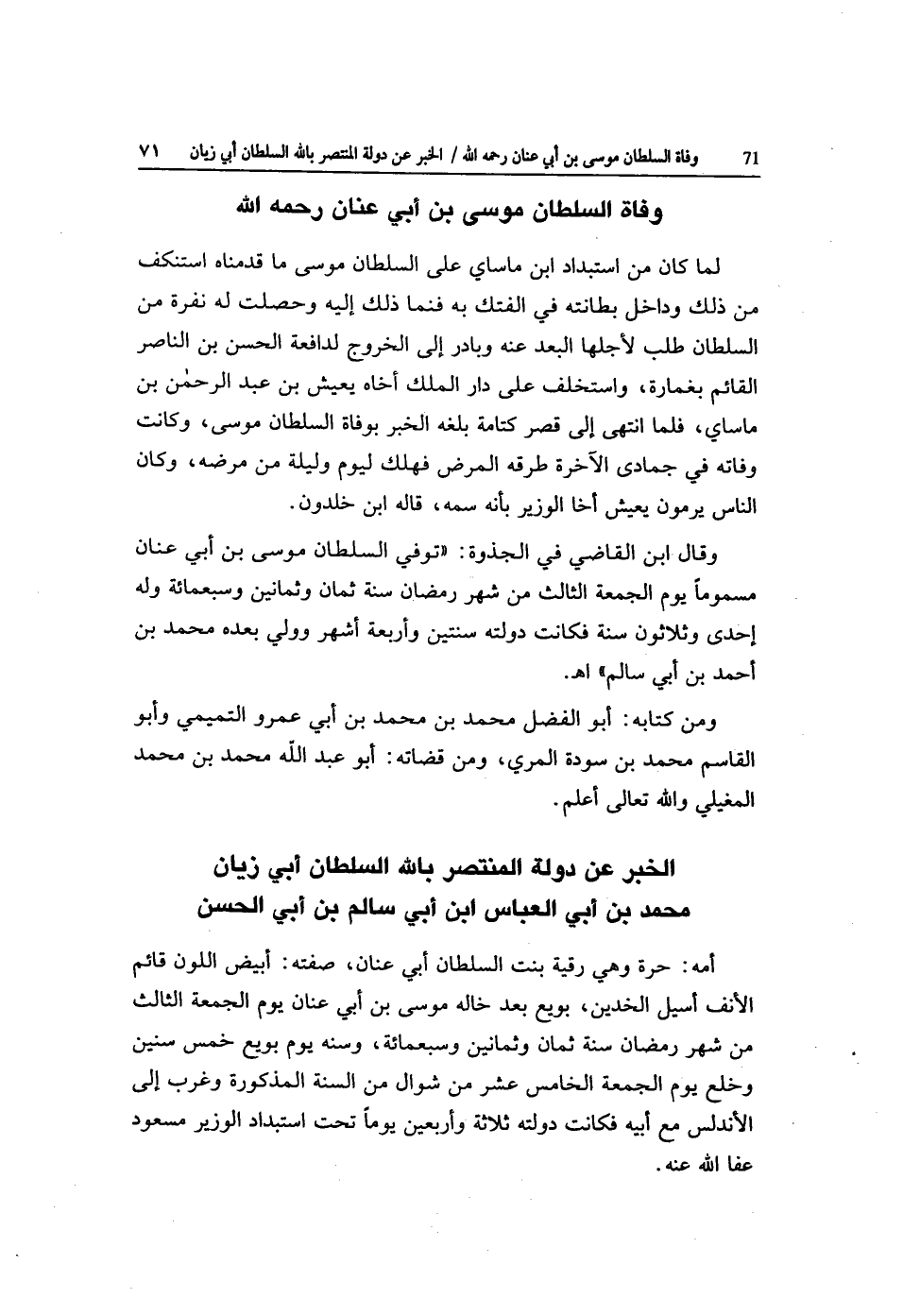 الْخَبَر عَن دولة الْمُنْتَصر بِاللَّه السُّلْطَان أبي زيان مُحَمَّد بن أبي الْعَبَّاس ابْن أبي سَالم بن أبي الْحسن