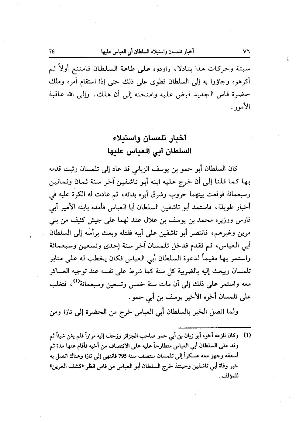 كَانَ السُّلْطَان أَبُو حمو بن يُوسُف الزياني قد عَاد إِلَى تلمسان وَثَبت قدمه بهَا كَمَا قُلْنَا إِلَى أَن خرج عَلَيْهِ ابْنه أَبُو تاشفين آخر سنة ثَمَان وَثَمَانِينَ وَسَبْعمائة فَوَقَعت بَينهمَا حروب وشرق أَبوهُ بدائه ثمَّ عَادَتْ لَهُ الكرة عَلَيْهِ فِي أَخْبَار طَوِيلَة فاستمد أَبُو تاشفين السُّلْطَان أَبَا الْعَبَّاس فأمده بِابْنِهِ الْأَمِير أبي فَارس ووزيره مُحَمَّد بن يُوسُف بن علال عقد لَهما على جَيش كثيف من بني مرين وَغَيرهم فانتصر أَبُو تاشفين على أَبِيه فَقتله وَبعث بِرَأْسِهِ إِلَى السُّلْطَان أبي الْعَبَّاس ثمَّ تقدم فَدخل تلمسان آخر سنة إِحْدَى وَتِسْعين وَسَبْعمائة وَاسْتمرّ بهَا مُقيما لدَعْوَة السُّلْطَان أبي الْعَبَّاس فَكَانَ يخْطب لَهُ على مَنَابِر تلمسان وَيبْعَث إِلَيْهِ بالضريبة كل سنة كَمَا شَرط على نَفسه عِنْد تَوْجِيه العساكر مَعَه وَاسْتمرّ على ذَلِك إِلَى أَن مَاتَ سنة خمس وَتِسْعين وَسَبْعمائة فتغلب على تلمسان أَخُوهُ الْأَخير يُوسُف بن أبي حمو